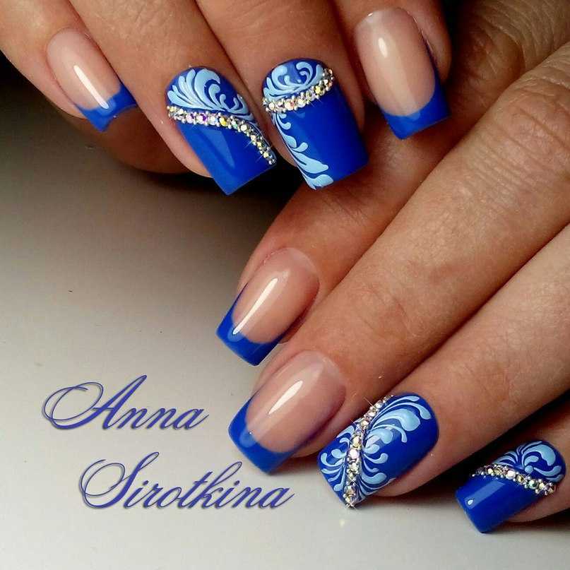 Синий цвет будет отлично смотреться в новогоднем маникюре, если вам нужно вписаться в холодный, бодрящий сезон зимы. Актуальным будет французский маникюр в синем цвете, дизайн омбре, негативное пространство, рисунки снежинок и других новогодних атрибутов.