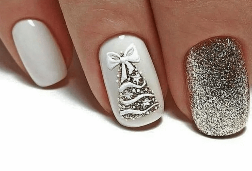Не менее эффектно смотрится зимний маникюр с елочками, дополненный украшениями в виде страз или блесток. Такой дизайн будет отлично вписываться в любой праздничный образ!