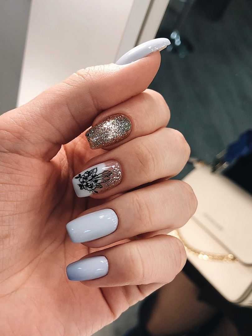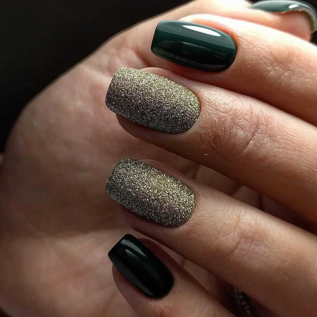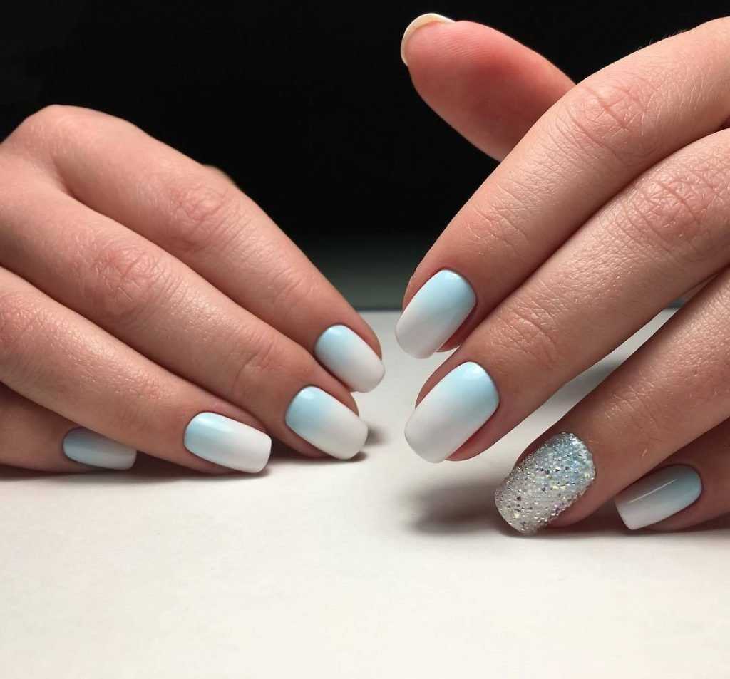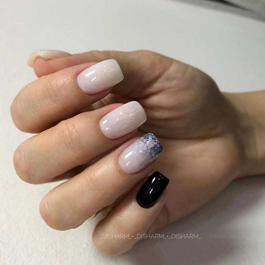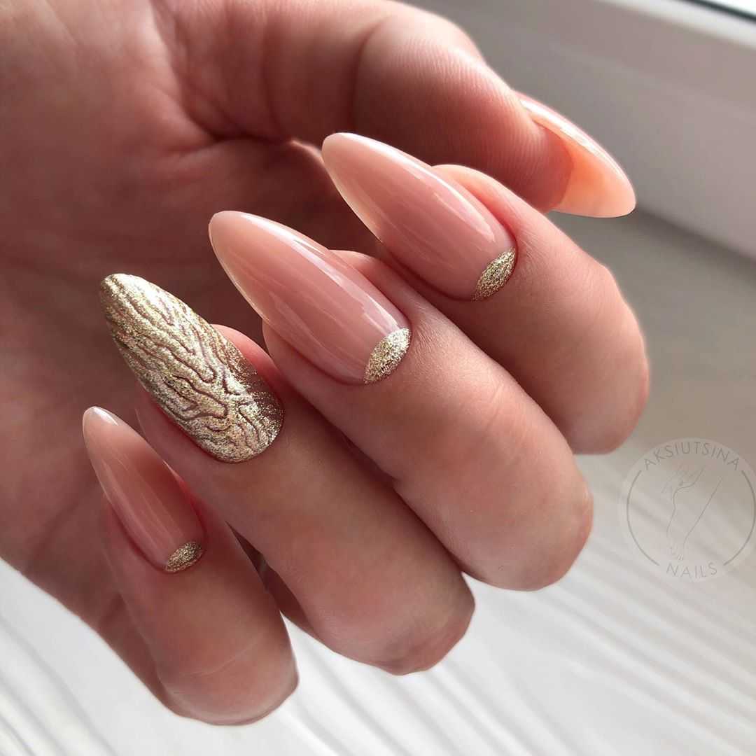 Лучшим решением для однотонного маникюра станет золотой или серебряный лак на безымянной пальце. Такой дизайн представляет собой симбиоз минимализма, лаконичности и стиля. Используйте глиттер, фольгу, акрил или меланж и ваш монохромный маникюр заиграет новыми красками.