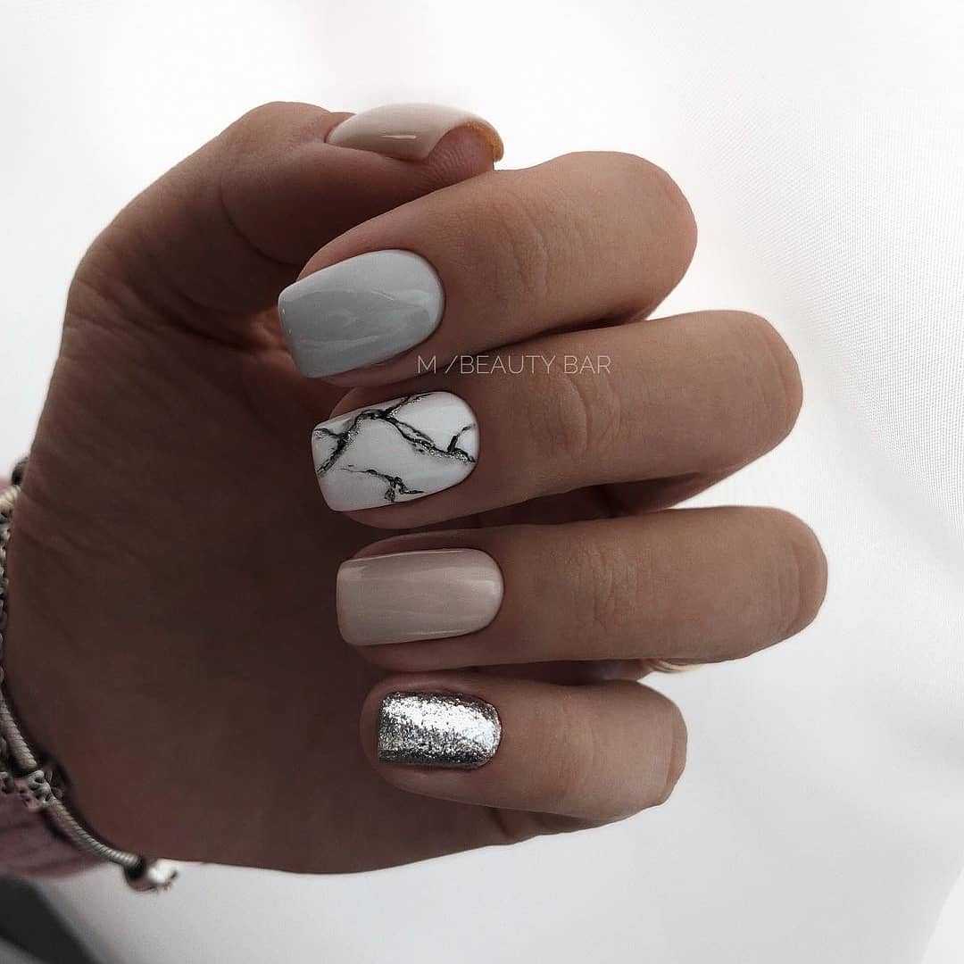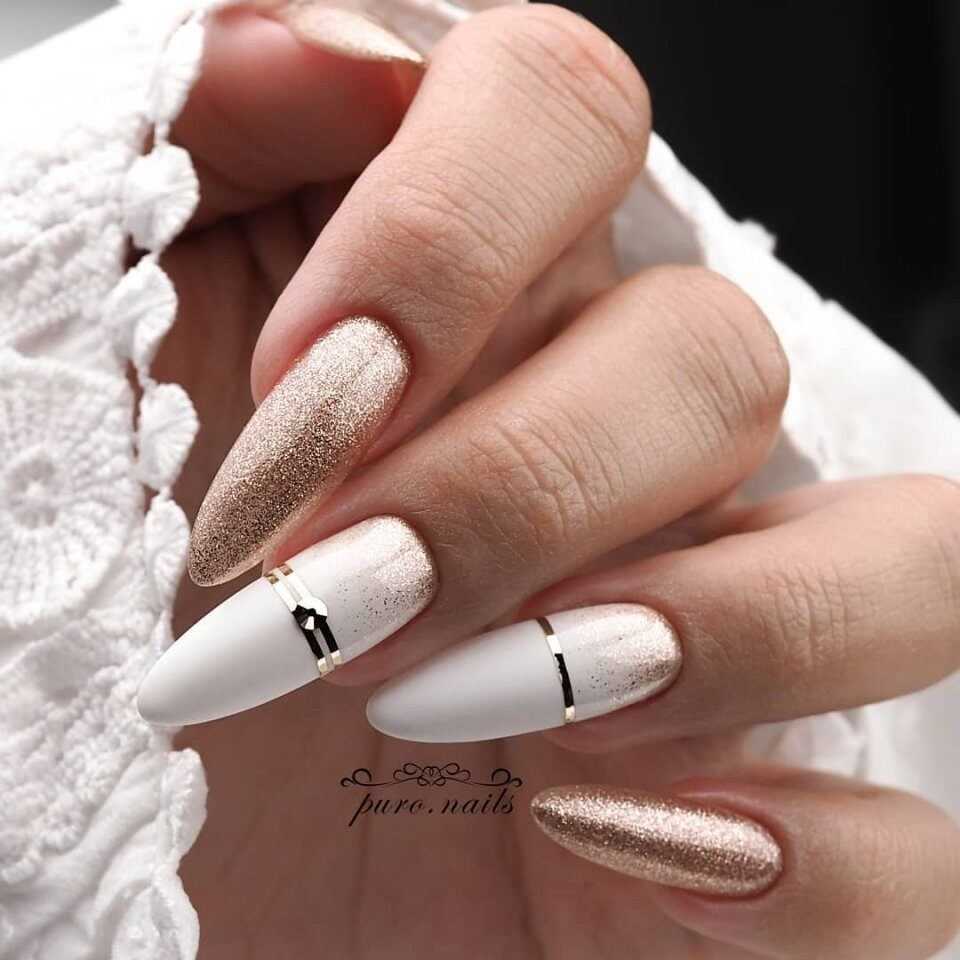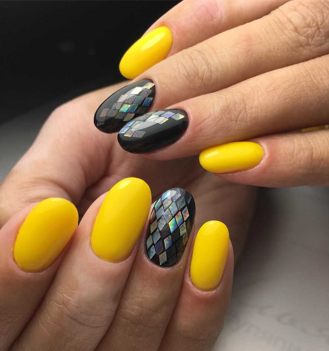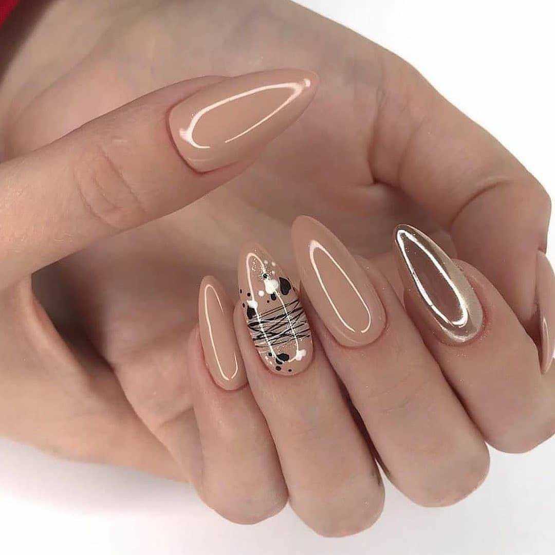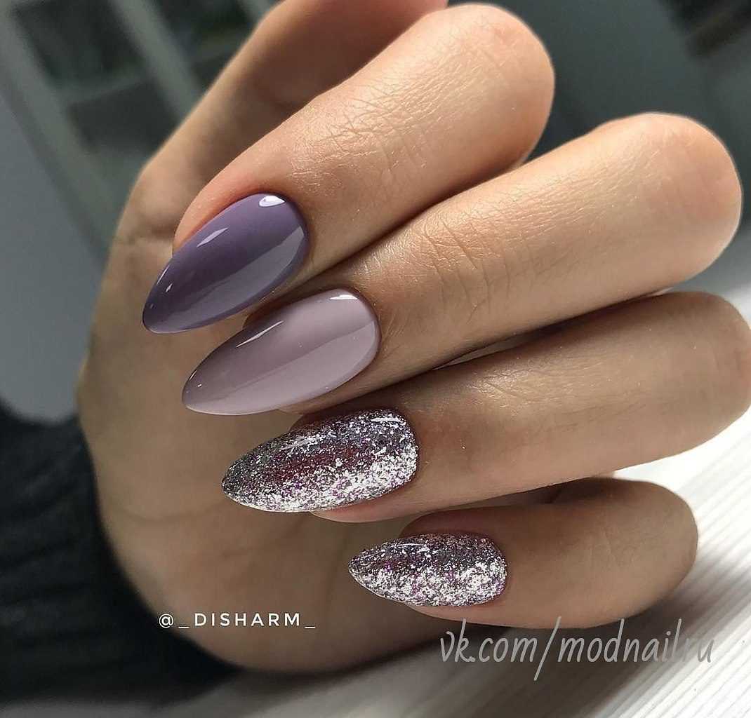 Лучшим решением для однотонного маникюра станет золотой или серебряный лак на безымянной пальце. Такой дизайн представляет собой симбиоз минимализма, лаконичности и стиля. Используйте глиттер, фольгу, акрил или меланж и ваш монохромный маникюр заиграет новыми красками.