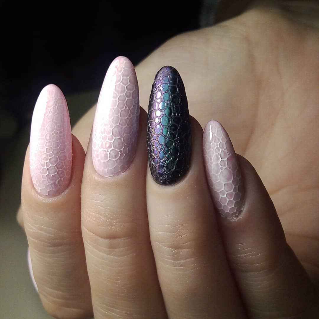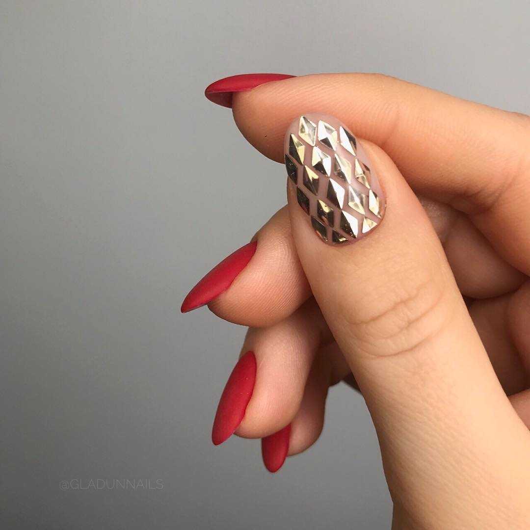 Когда привычные, актуальные ранее идеи оформления слегка наскучили, самое время присмотреться к новинкам дизайна. Одной из таких является покрытие с эффектом «чешуи дракона». Это объемные ромбики из фольги. Их главная особенность — характерный металлический блеск, который видно даже на расстоянии. Эти детали часто используют не только для создания узора на ногтевой пластине, но и для полного покрытия. Благодаря чему и получается эффект чешуи. Интересно, что несмотря на яркость дизайна, в некоторых случаях его комбинируют со стразами или другими металлическими деталями. Отдельно отметим, что прикрепляют его в основном на базу, специальный клей или гель-пасту. В конце обязательно надо нанести топовое покрытие для лучшего закрепления.