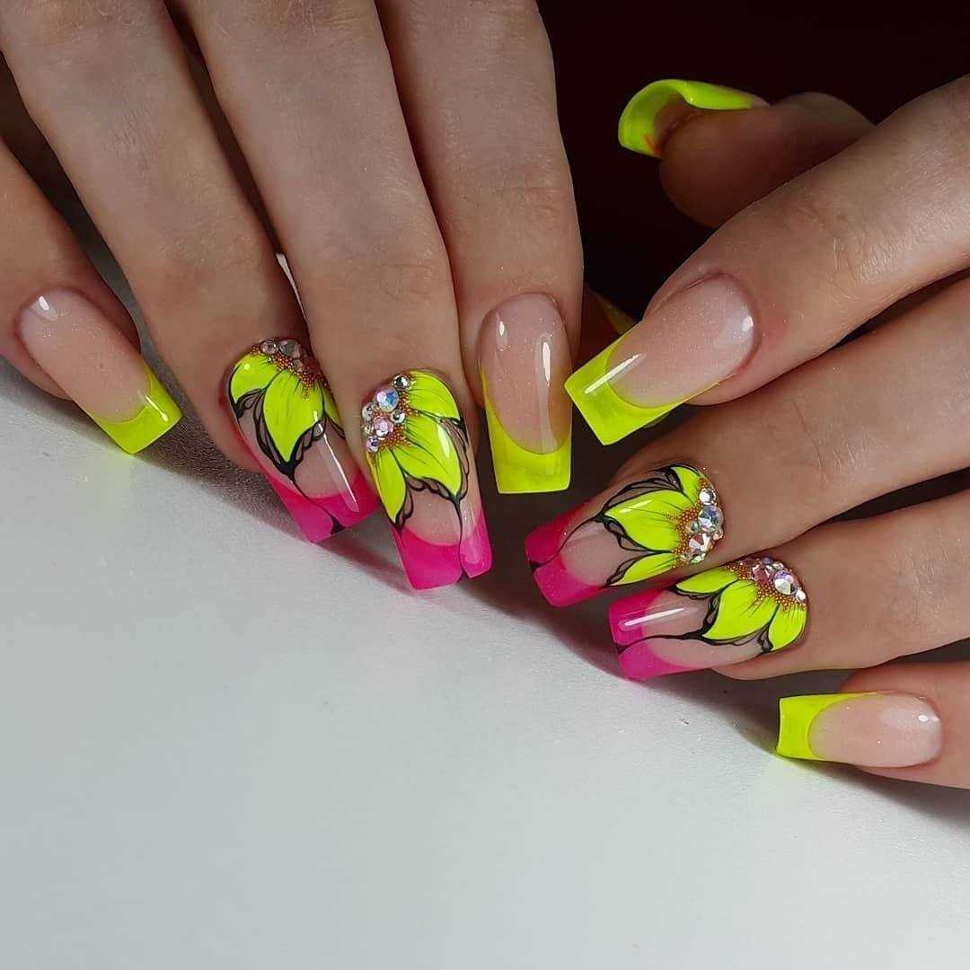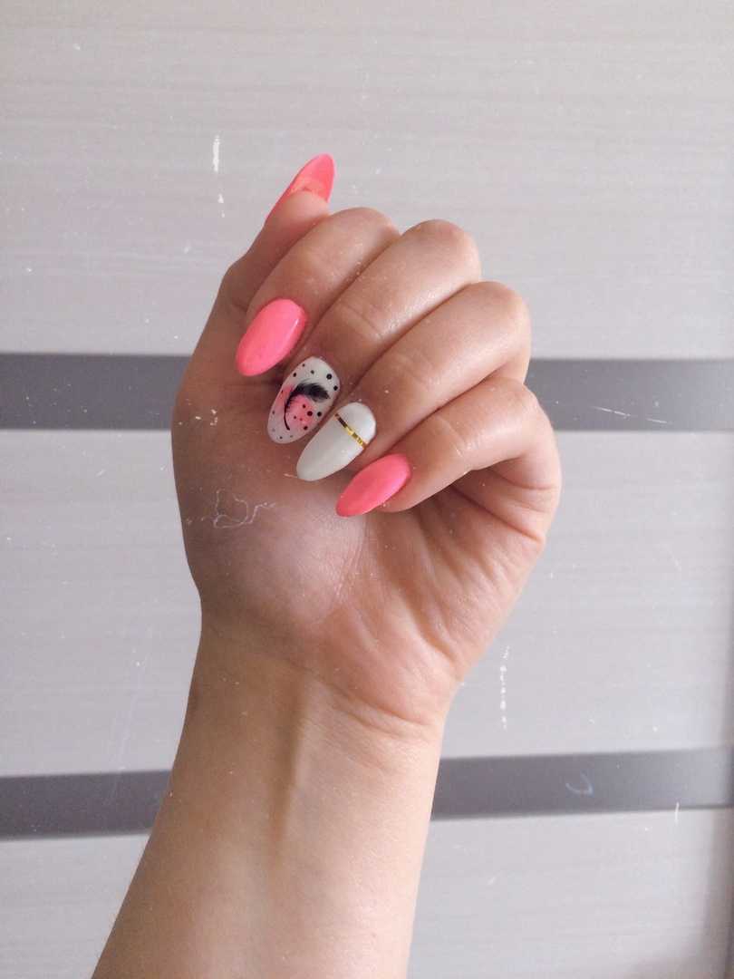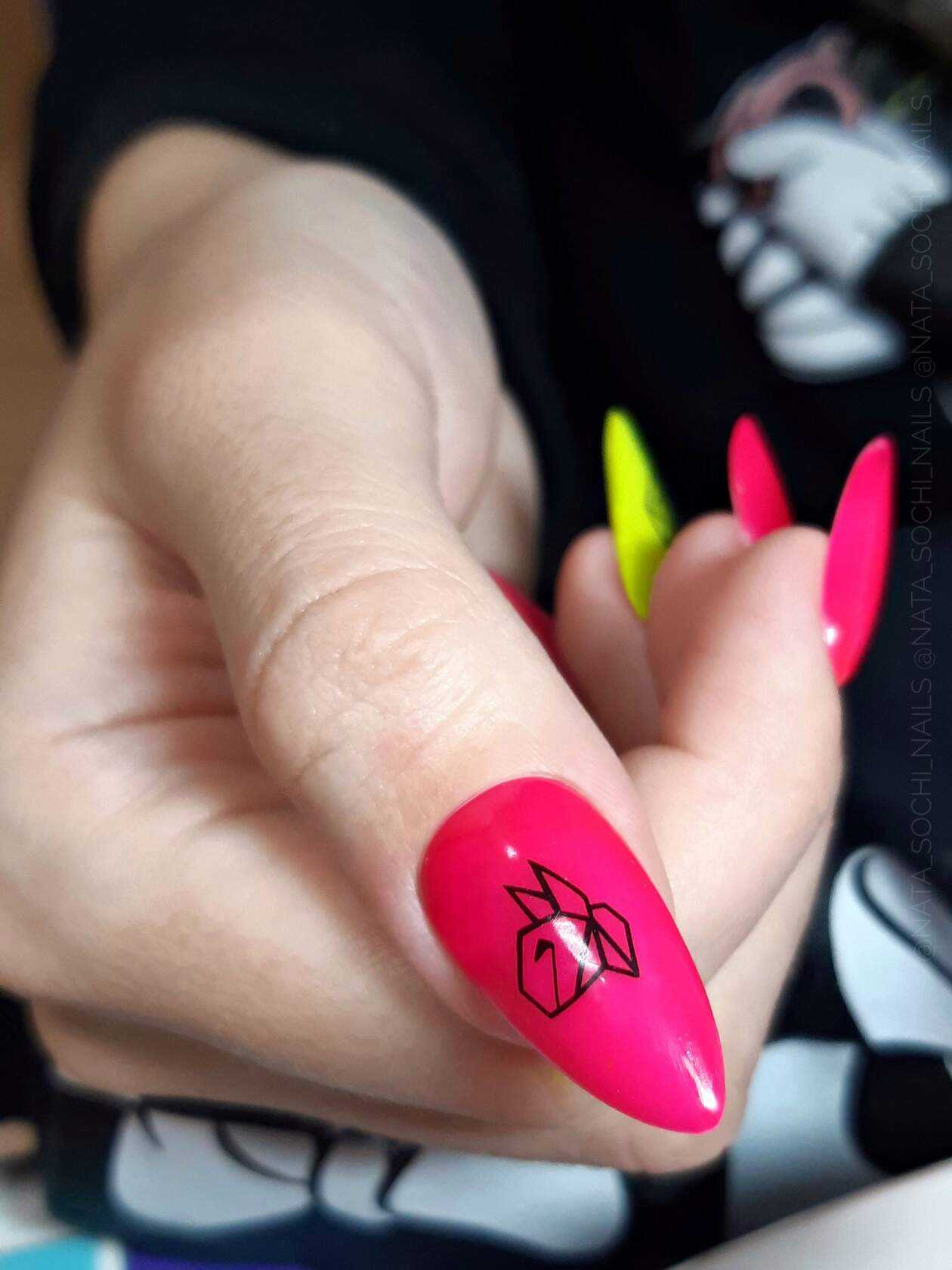 Лето можно уверенно назвать самым ярким временем года, когда каждая модница может уверенно экспериментировать с выбором цветового исполнения составляющих деталей своего образа. Яркие неоновые акценты на ноготках в этом случае станут идеальным решением. Сущность подобного предложения заключается в нанесении на покрытие нейтрального цвета ярких неоновых узоров в виде мазков, клякс и потёков. Рисунки могут выполняться в одном цвете или демонстрировать впечатляющую растяжку оттенков. Любой из вариантов не останется незамеченным и позволит ноготкам выглядеть по-летнему свежо.