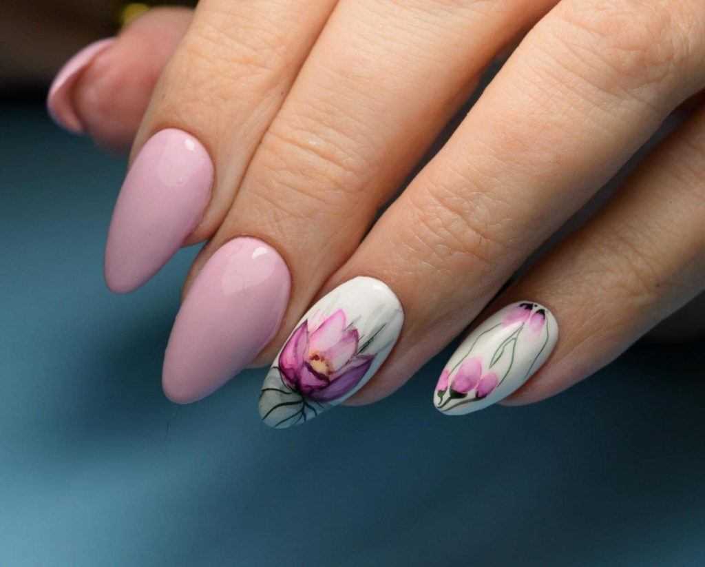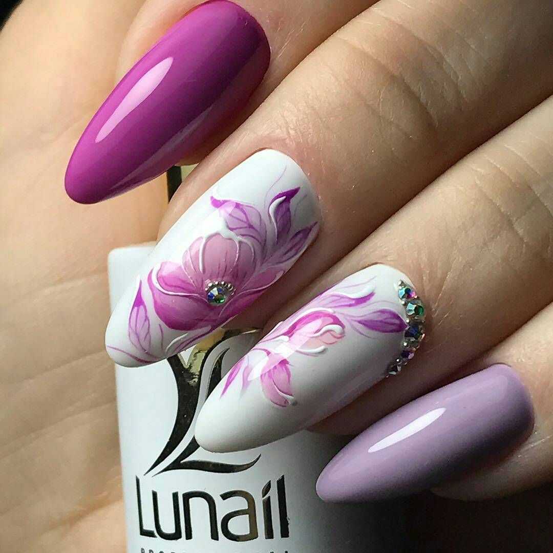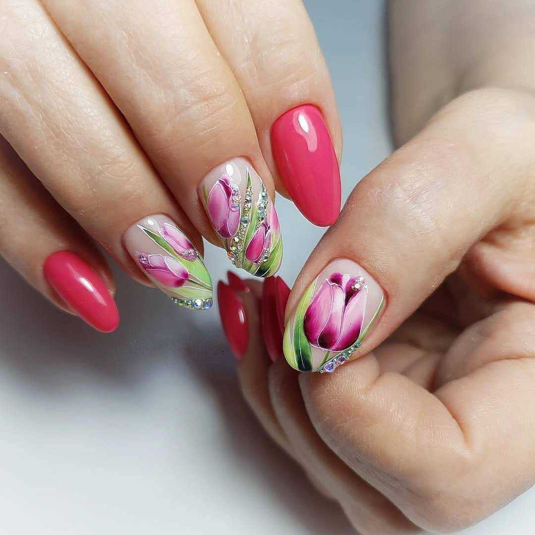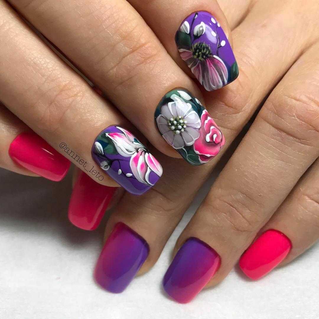 Как весной, так и летом одним из наиболее актуальных видов дизайна считается цветочный рисунок. В тренде 2020 года не только маленькие бутоны и веточки, но и крупные, объемные цветы. Каждый из них создает совершенно разный эффект на ноготках. Тем более, многое зависит от основного покрытия. При желании всегда можно добавить небольшое количество страз или блесток, чтобы подчеркнуть красоту дизайна.