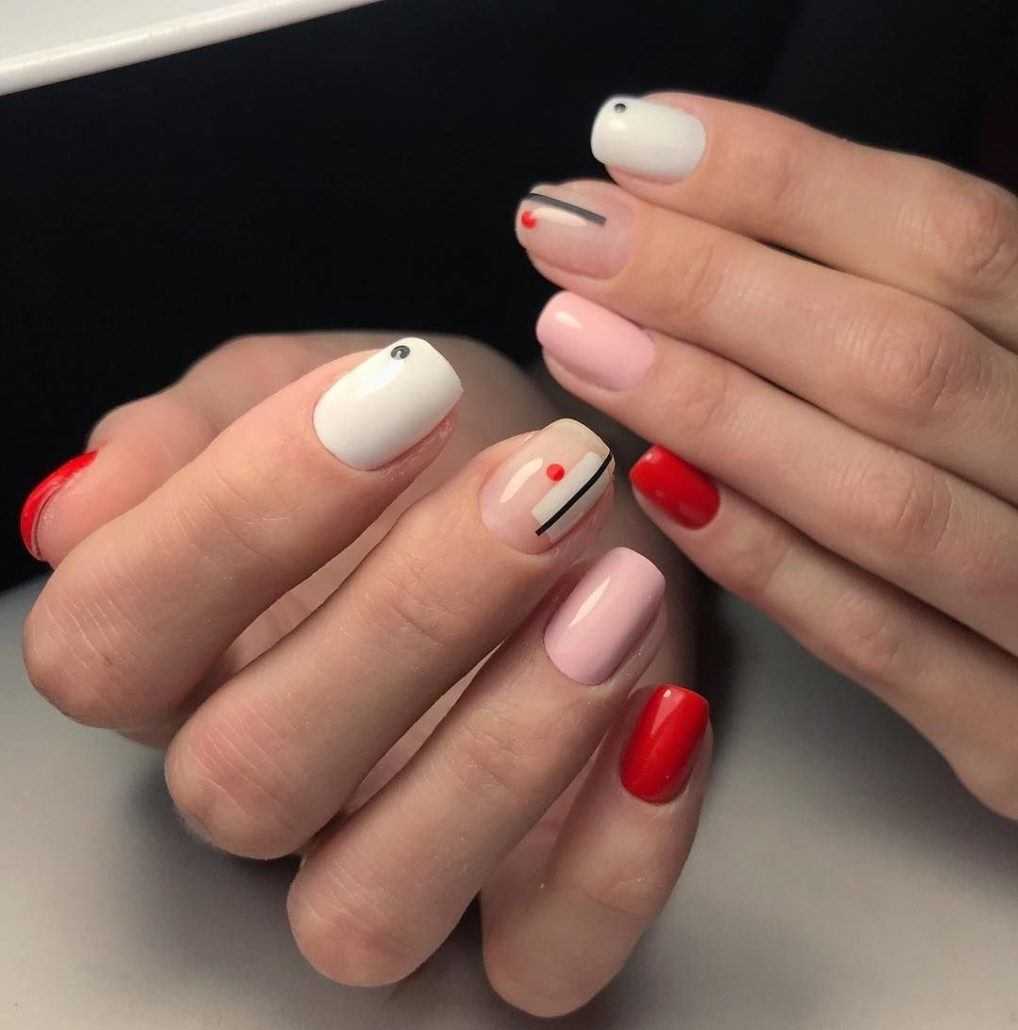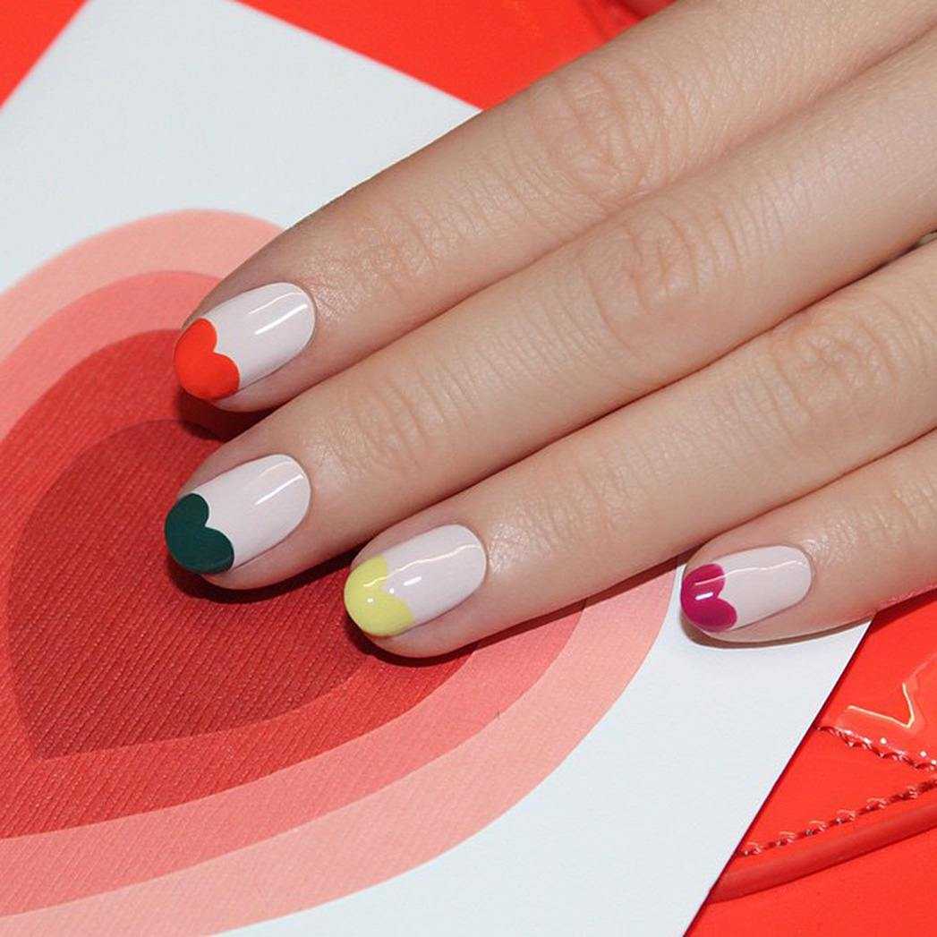 В французском дизайне лета 2020 замените классическую белую полоску на разноцветную, сместите ее, сделайте шире или двойной. Это же касается лунного маникюра. Сделайте лунулу нестандартной формы, возможно даже сердечком, сместите ее в сторону, прорисуйте необычные границы лунки.