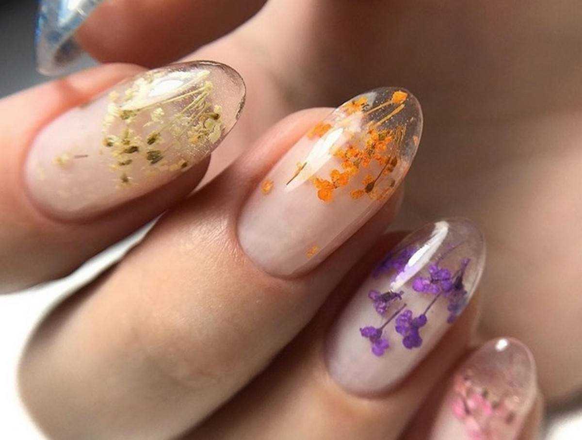 Несомненно, цветочный маникюр — едва ли не самый популярный в современном нейл-арте. Но все же предлагаем взглянуть на его разновидность на основе сухоцветов. Такие детали максимально простые в использовании, но при этом создают невероятной красоты маникюр. В основном основой в данным случае выступают нейтральные или полупрозрачные оттенки гель-лака. Благодаря чему маникюр получается особенно нежным, романтичным.