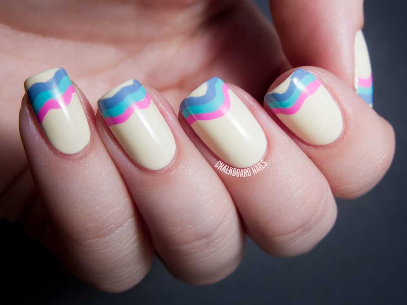Не спешите отводить глаза и отодвигать в сторону этот вариант маникюра. Не смотря на простоту названия, полоски на ноготках могут в этом сезоне приятно удивить даже самых привередливых красавиц. Летний маникюр с подобными узорами в первую очередь подразумевает не только вертикальное и горизонтальное расположение деталей, но и использование блестящих структур, ярких гель-лаков, всевозможных блёсток и даже полосок, напоминающих по виду ажурные ленты. Такие украшения очень красиво смотрятся на основе любого цвета и станут прекрасным дополнением любого женского образа.