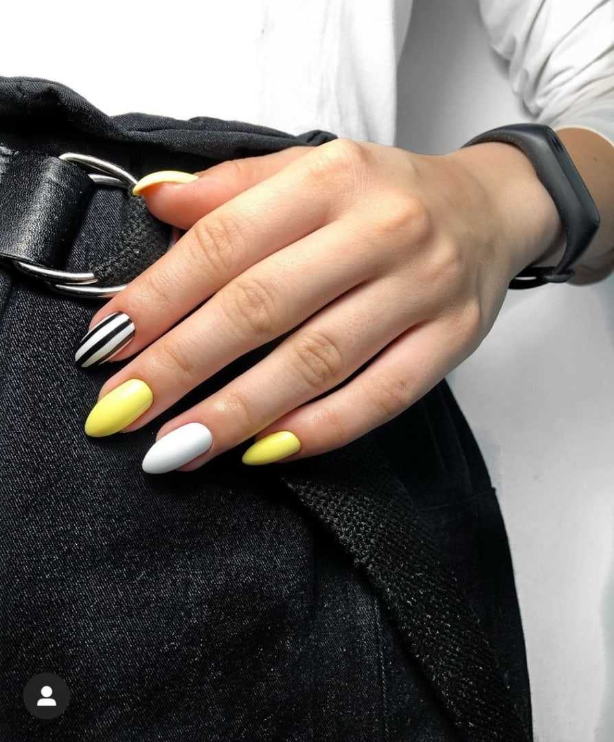 Скотч-ленту в качестве декора использовали довольно давно. Но только в 2020 году она стала настоящим хитом нейл-арта. Все потому, что она существует в самых разных оттенках и хорошо сочетается со многими видами покрытия. К тому же, работать с ней сплошное удовольствие даже для новичков. Главное — делать небольшое отступление от края ноготка, чтобы декор не цеплялся ни за что и не отставал. Для лучшей фиксации всегда наносите поверх декора топовое покрытие.