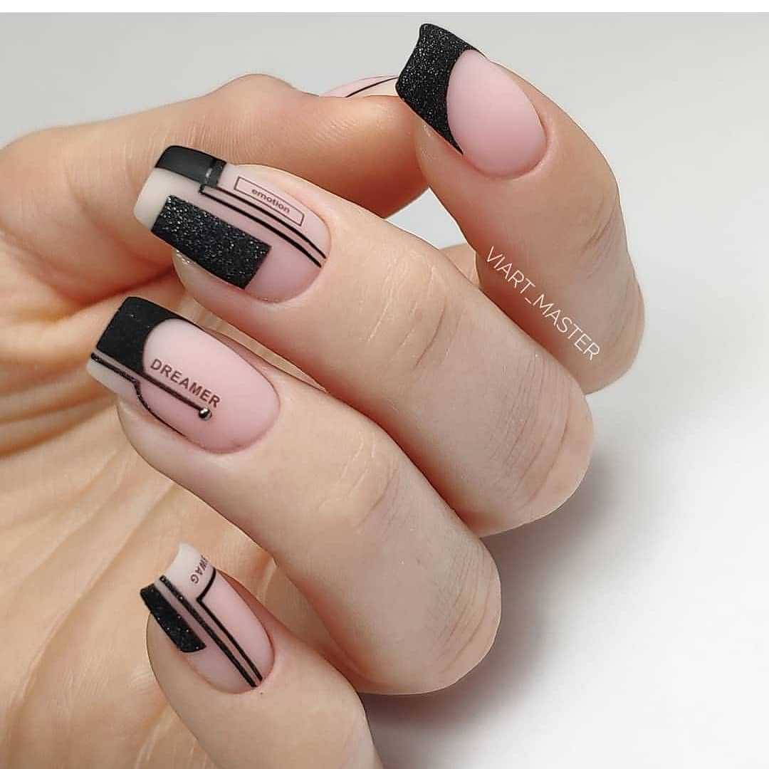 Нюдовый маникюр прекрасно выглядит и в матовом, и в глянцевом исполнении. Можно сыграть на контрасте, глянцевый маникюр дополнить матовыми элементами, добавить втирку, блестки или фольгу. Очень красиво смотрится нюдовый маникюр в стиле геометрия.
