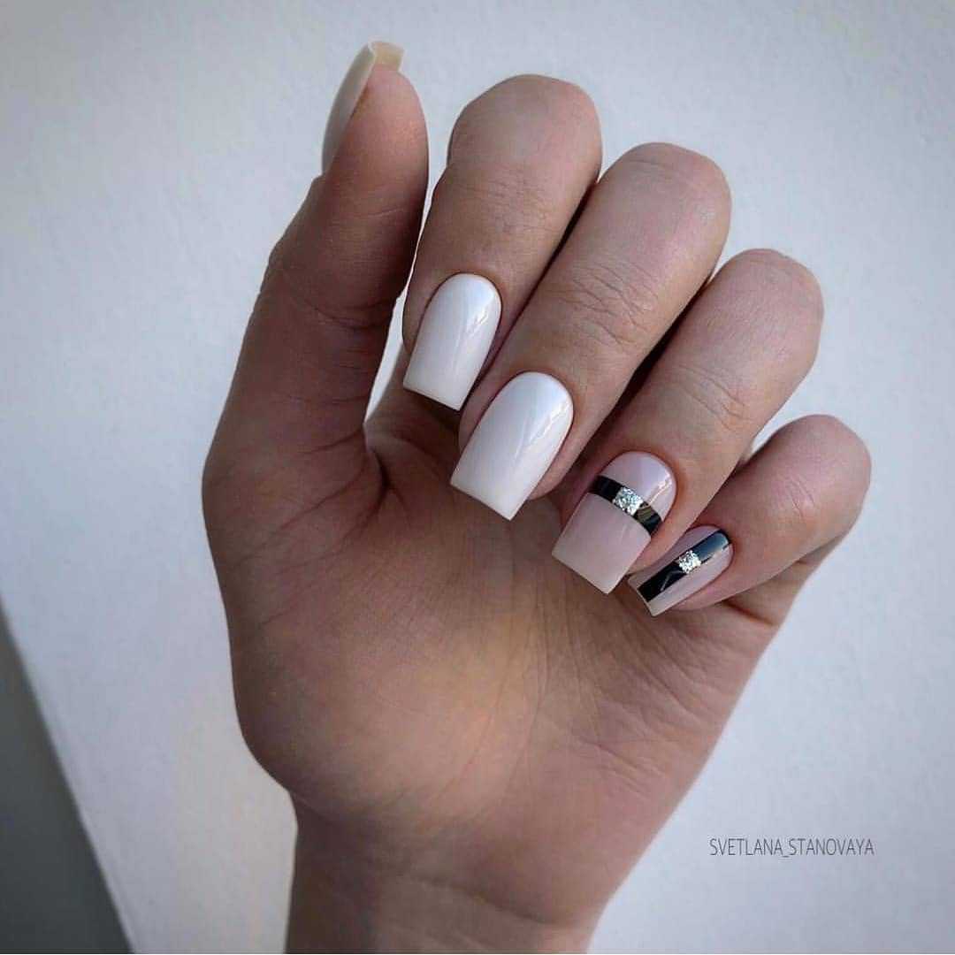 Необязывающая телесная тональность, богатая изобилием гамм, способствует созданию замечательных вариантов различных стилистических направлений. Светлый молочный или приближенный к тону кожи цвет может быть самостоятельным либо стать деталью смешанного нэйл-арта.