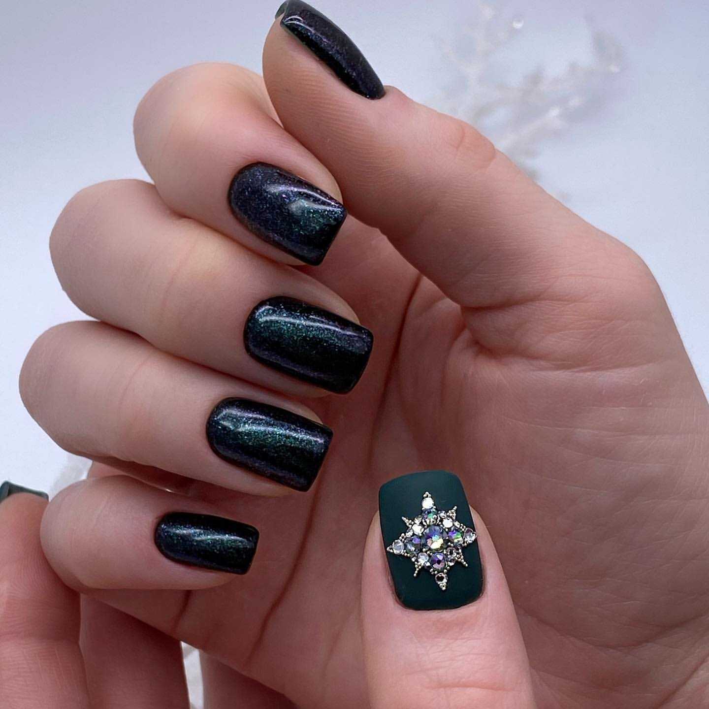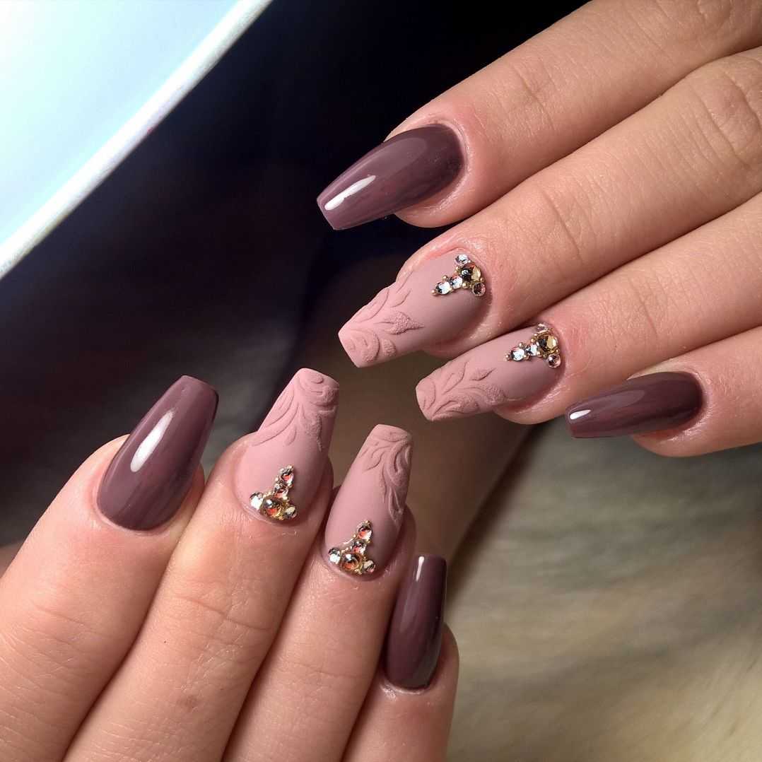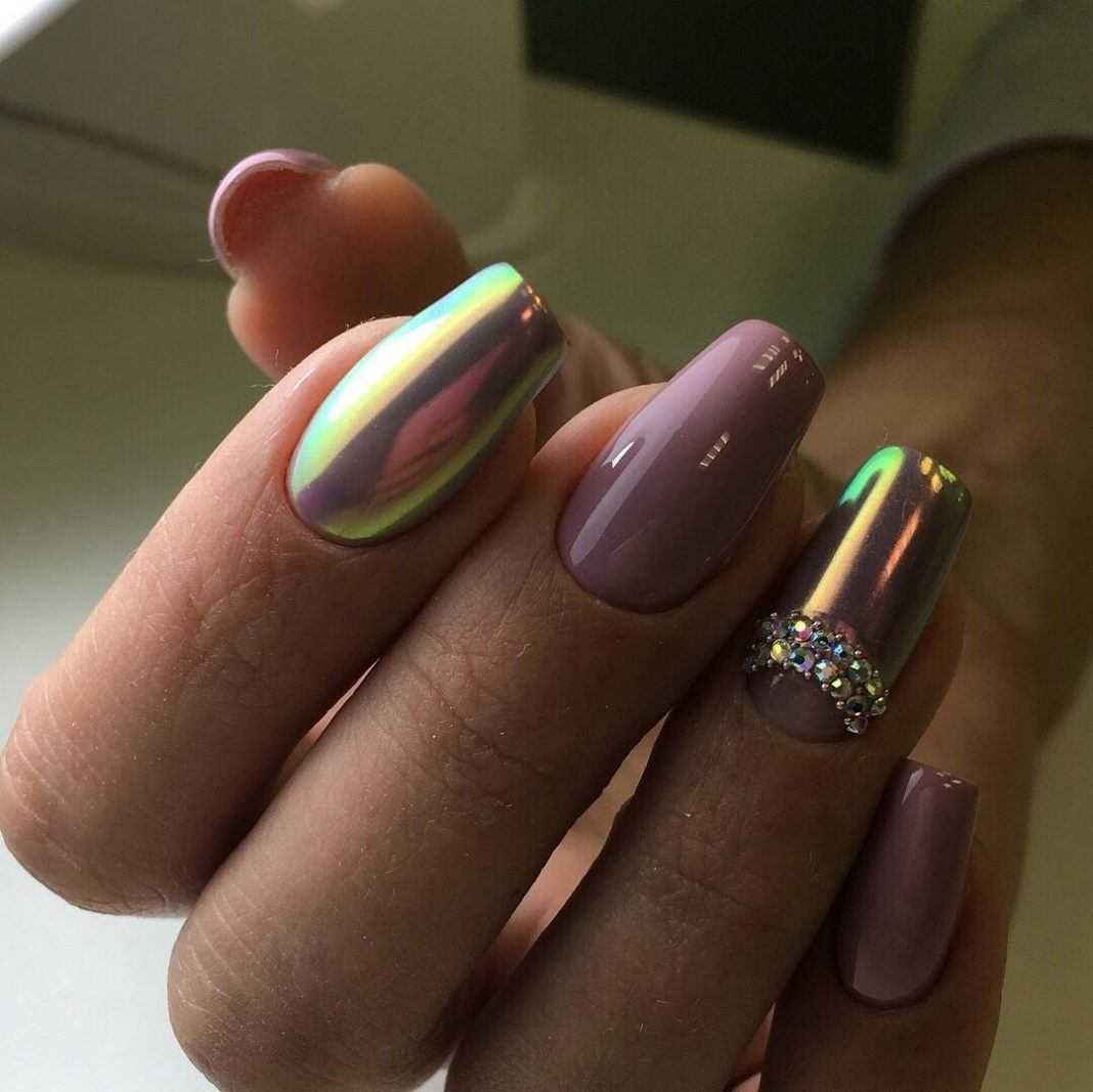 Камни и блестки сочетаются со всеми нюдовыми оттенками пасты, от темных оттенков 2021 года, привлекают внимание к черному, бордовому, синему, фиолетовому и зеленому. Блестки на длинных ногтях следует использовать как акцент на одном или двух ногтях