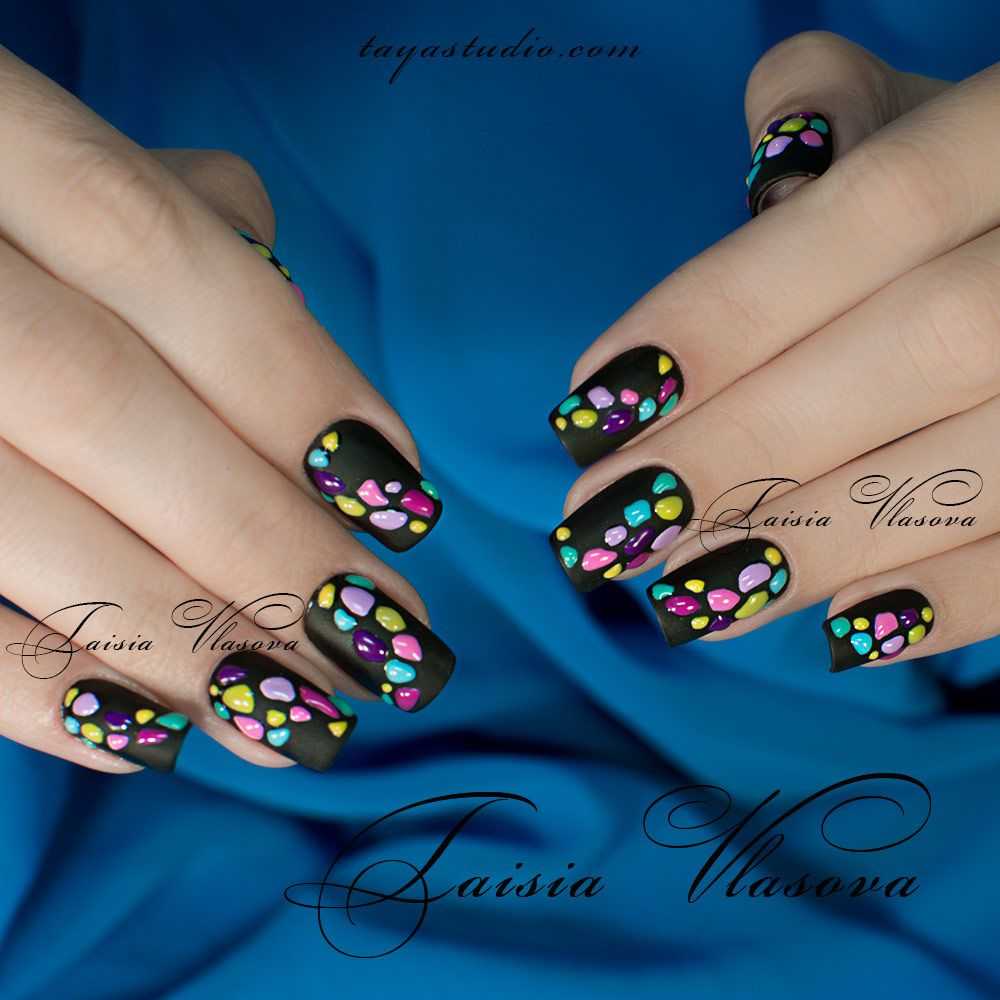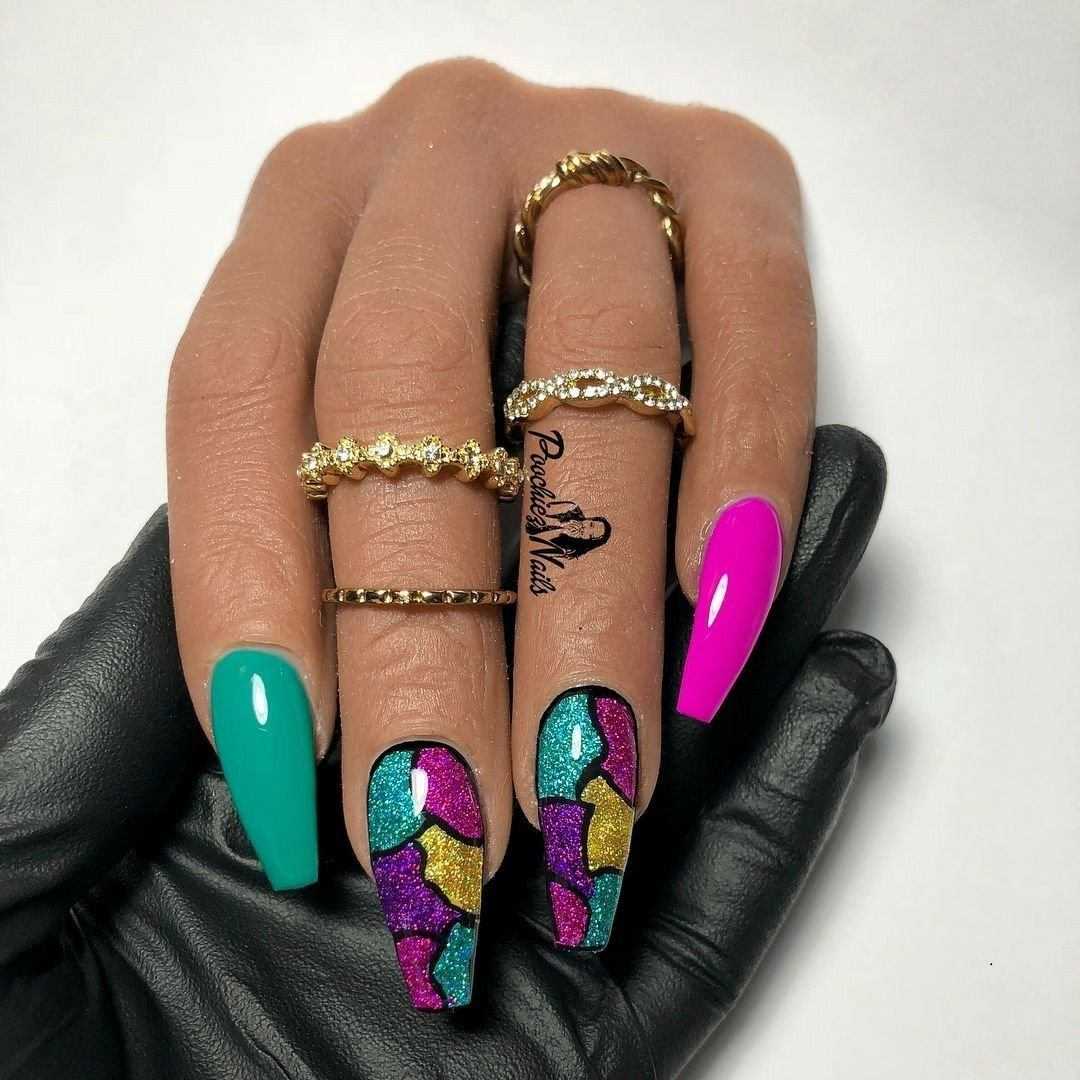 Необычный выразительный дизайн легко создать с применением потали или фольги. Поверх прозрачного покрытия в хаотичном порядке располагаются яркие пятна вперемешку с фольгой. Такой красивый дизайн точно не останется без внимания на вечеринке!