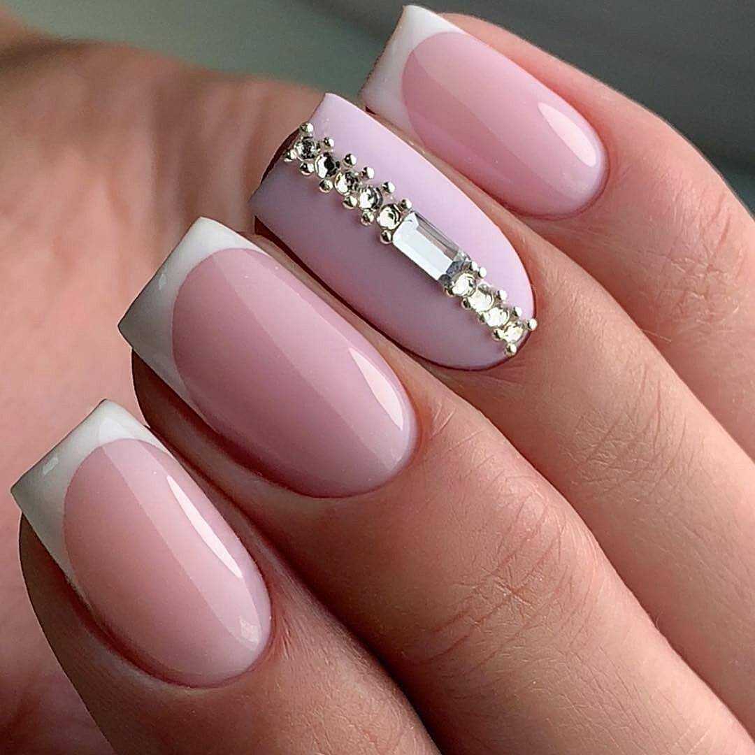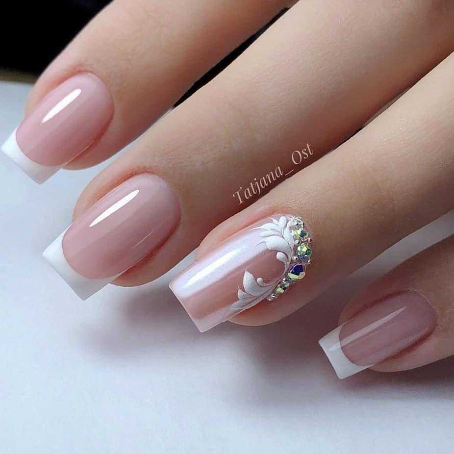 Подчеркнуть хрупкий девичий образ поможет нежно-розовый тон лака в сочетании с ноготками в технике «мрамор» или «кварц», а декор в виде светлых страз, полосок или бусинок сделает этот вариант привлекательным для невест.