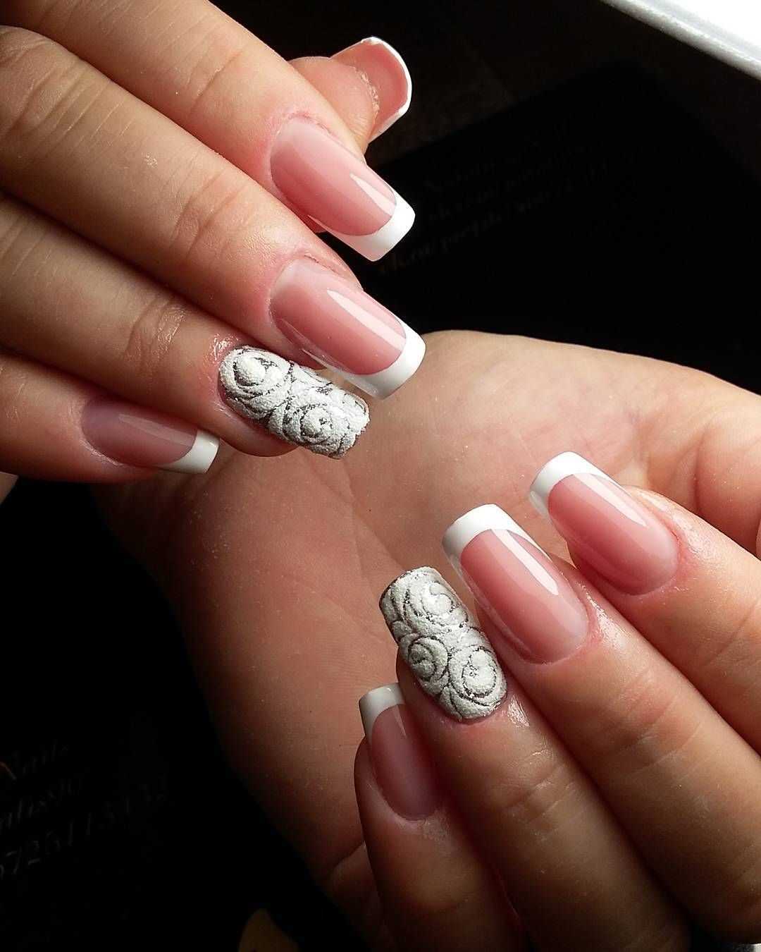 Модный праздничный френч 2021-2022 отличается акцентами в виде кружевных узоров на безымянном пальце, небольшими вкраплениями из камней или росписью. Для тех, кто не боится блеснуть с особым шиком, акценты могут выполняться с использованием втирок или в технике «битое стекло».