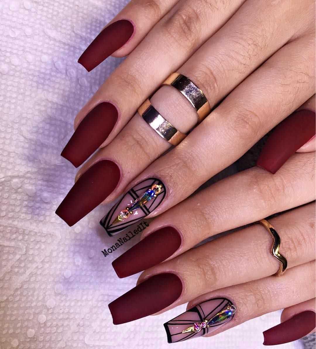 Длинные ногти идеально доходят для создания сложных видов праздничного нейл-арта. В целом тренды 2021-2022 отдают предпочтение минимализму в маникюре, нарядный вид достигается за счет сочетания текстур и элементов. Так матовый топ в дуэте с блестящими золотыми полосами или с блестками выглядит богато и торжественно.