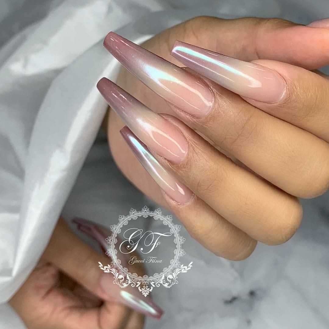Модный градиент, выполненный в цвете или при помощи блесток, прекрасно смотрится на длинных ногтях. Такой нарядный вариант не требует лишних украшений и сам по себе блестяще смотрится в праздничной обстановке.