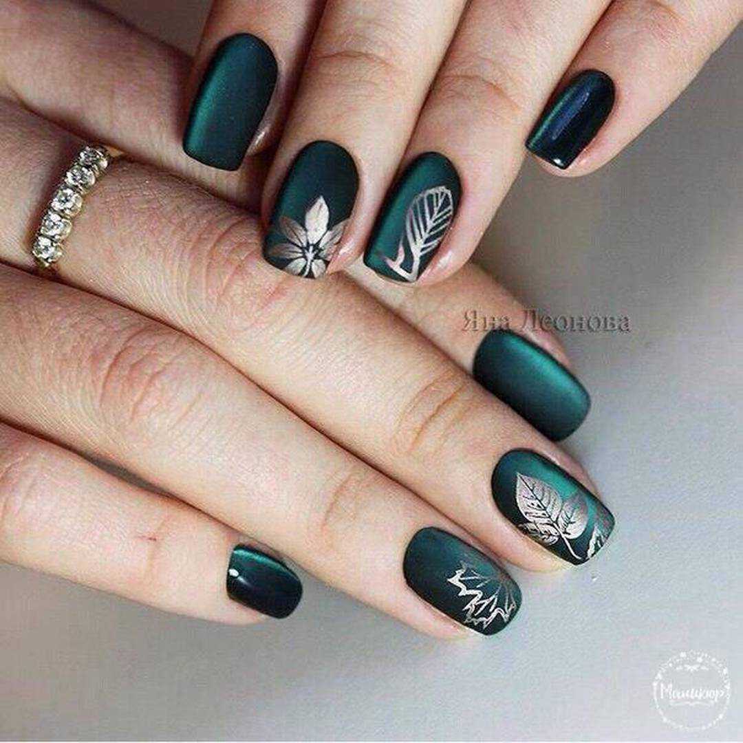 Сочетание матового топа и растительного узора будет выглядеть не менее эффектно. Используйте лак с мелким шиммером — в комбинации с матовым покрытием он обеспечит листьям приглушенно сияющий фон.