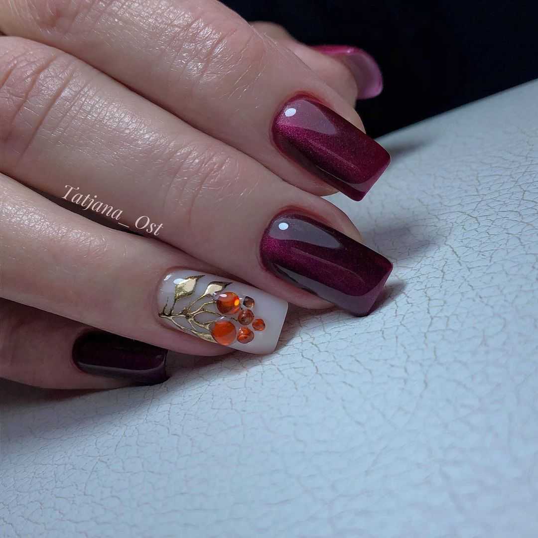 - чуть ниже осенних листочков приклейте с помощью прозрачного гель лака ярко-красные стразы, так, чтобы они визуально были похожи на веточку рябины;