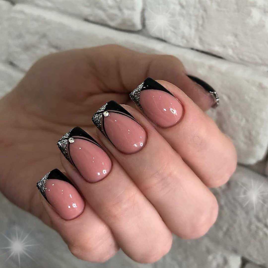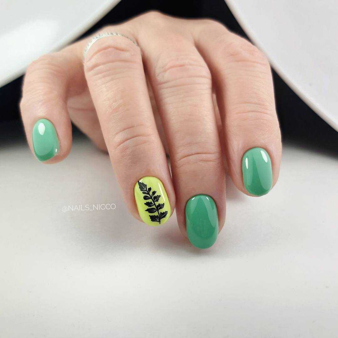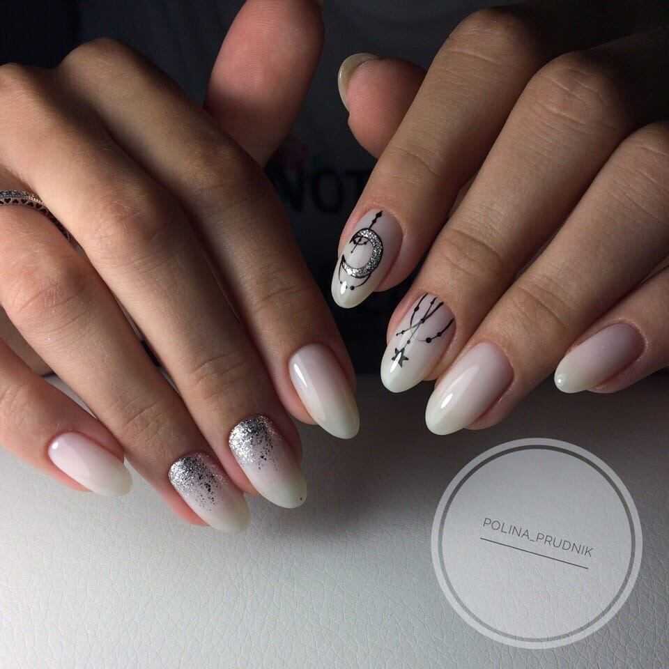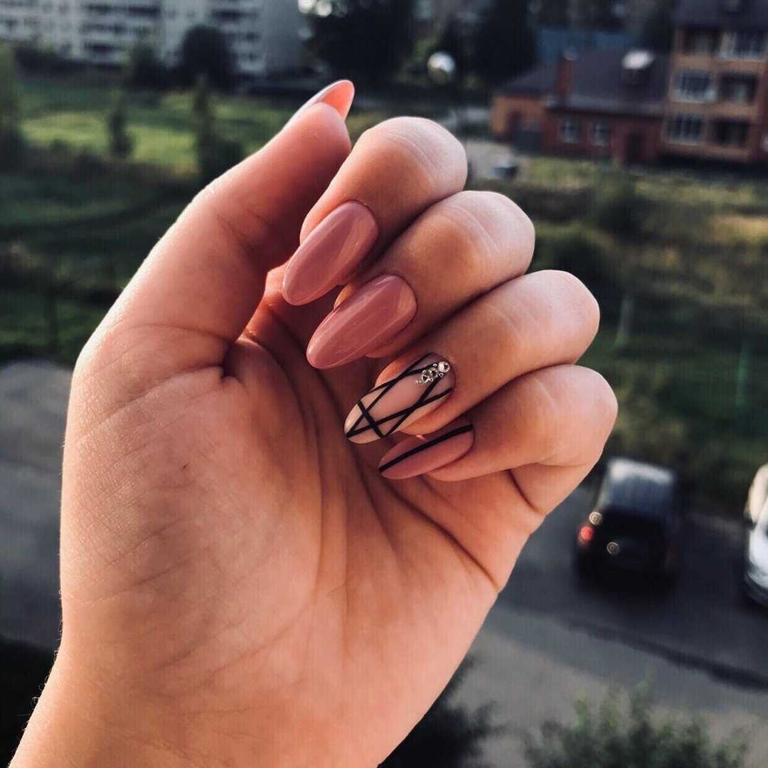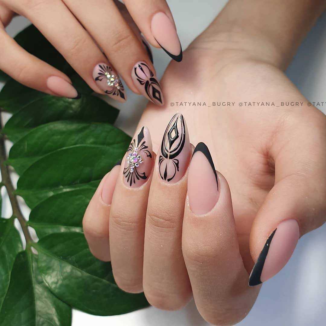 - темный декор – акценты в виде темных узоров на ногтях сегодня особенно популярны. Декор выполняется с помощью слайдеров, стемпинга или ручной росписью. Примеры таких нейл-артов вы сможете найти в большой фото-подборке в конце обзора.