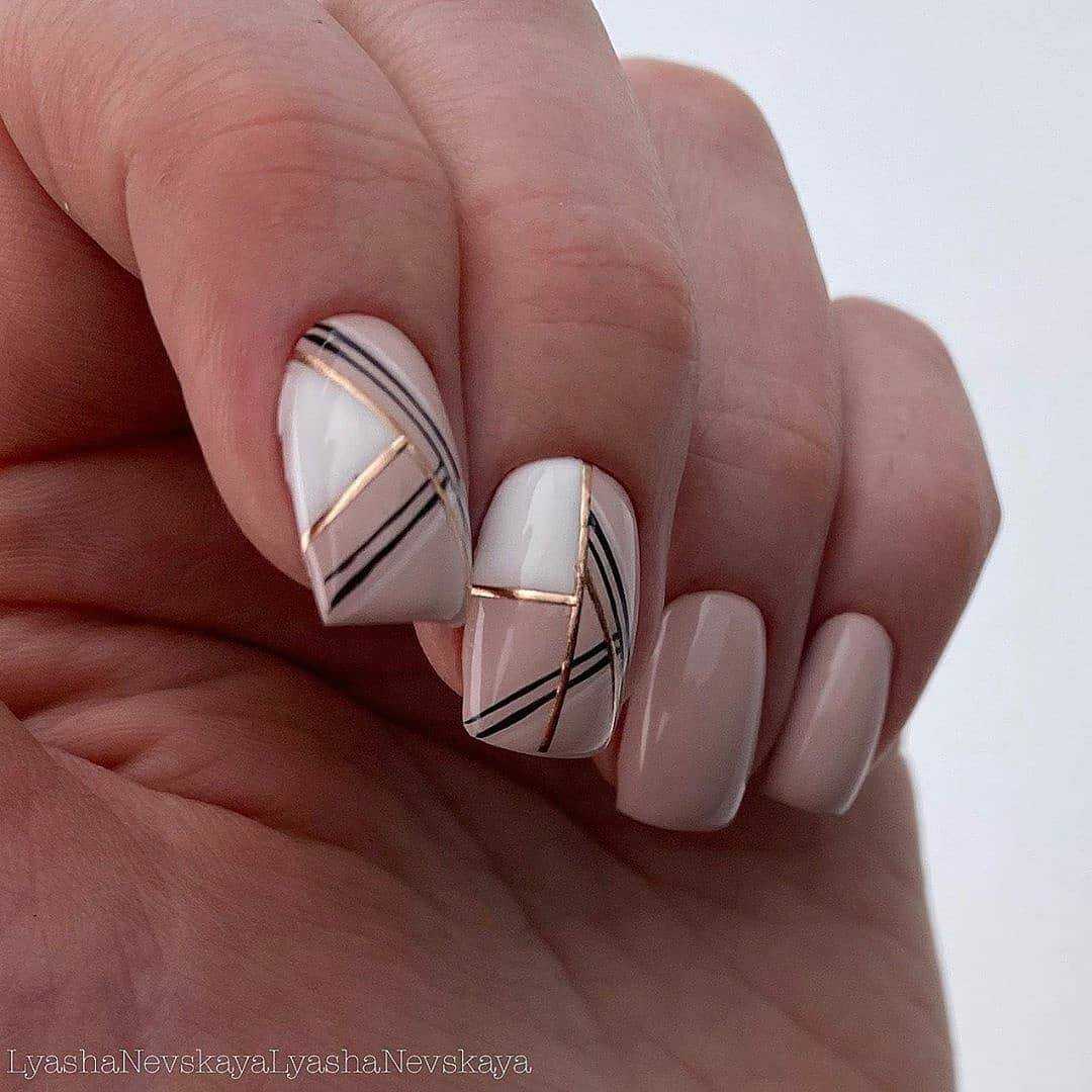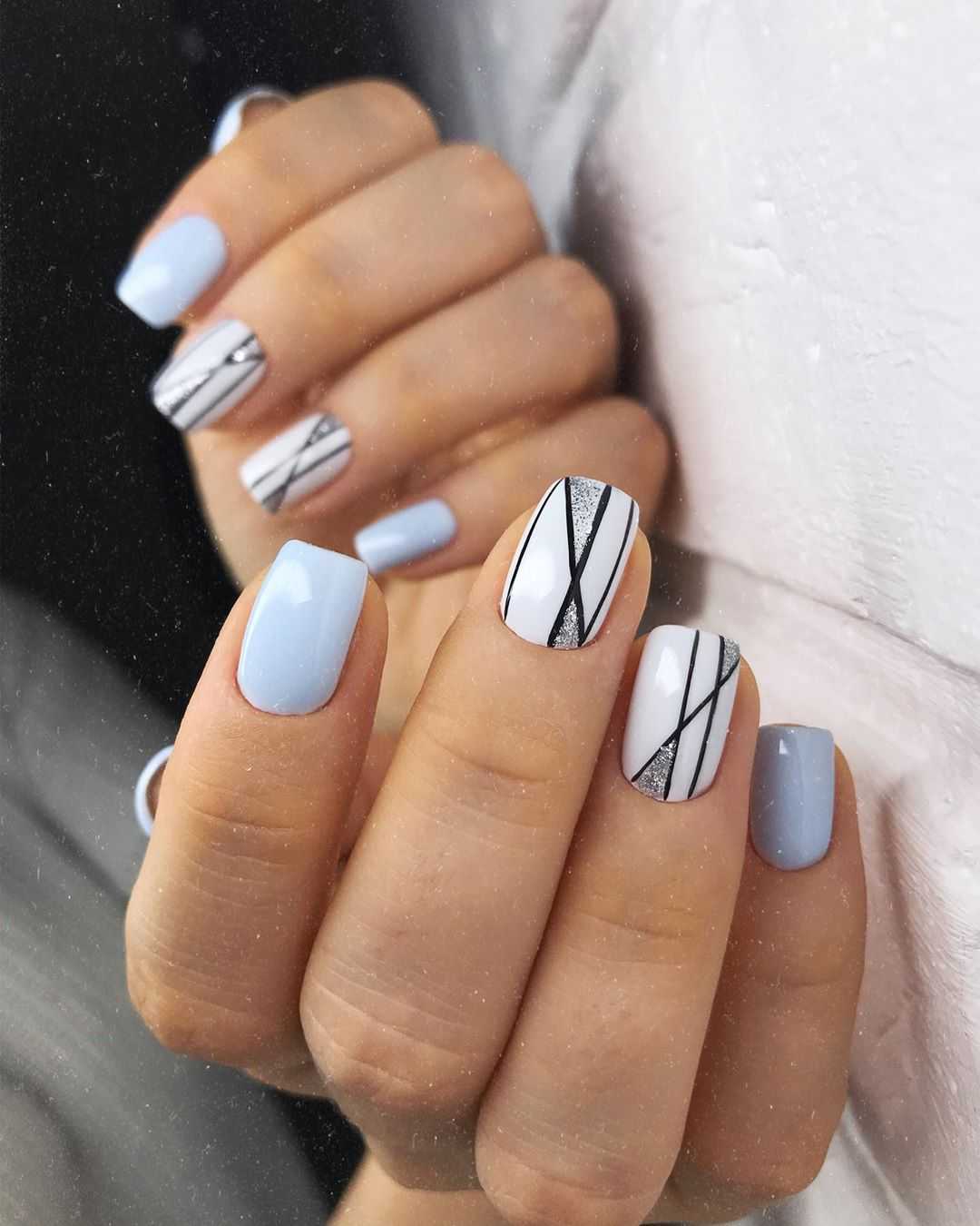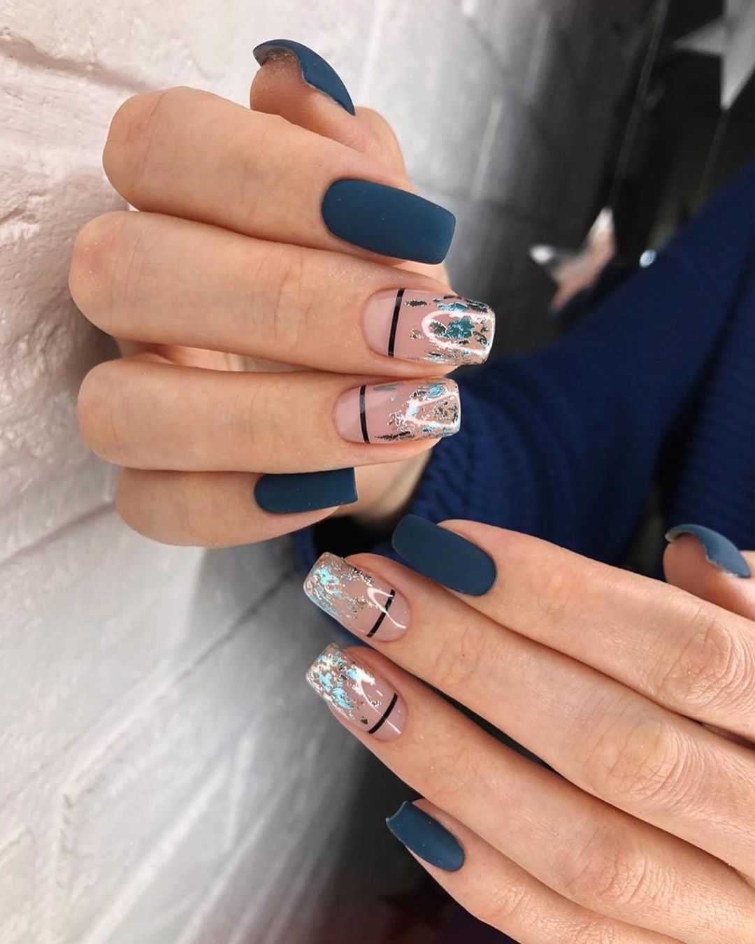 - фольгированные полосы – шикарно смотрятся в сочетании с матовым покрытием. В тренде матовый маникюр с негативным пространством, где закрашенные области отделяются от «пустых» с помощью тонких серебряных полос.