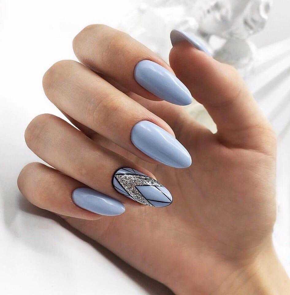 Дизайн ногтей шеллаком можно сделать и в любых тонах синего. Любители строгих цветов могут порадовать себя темными серыми оттенками. Его палитра разнообразна, поэтому всегда сможете найти себе нужный оттенок.