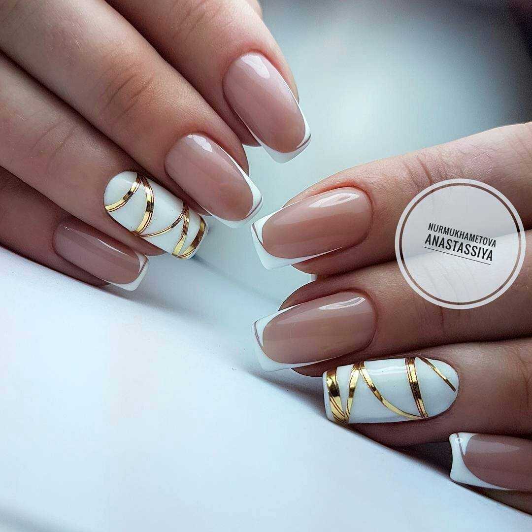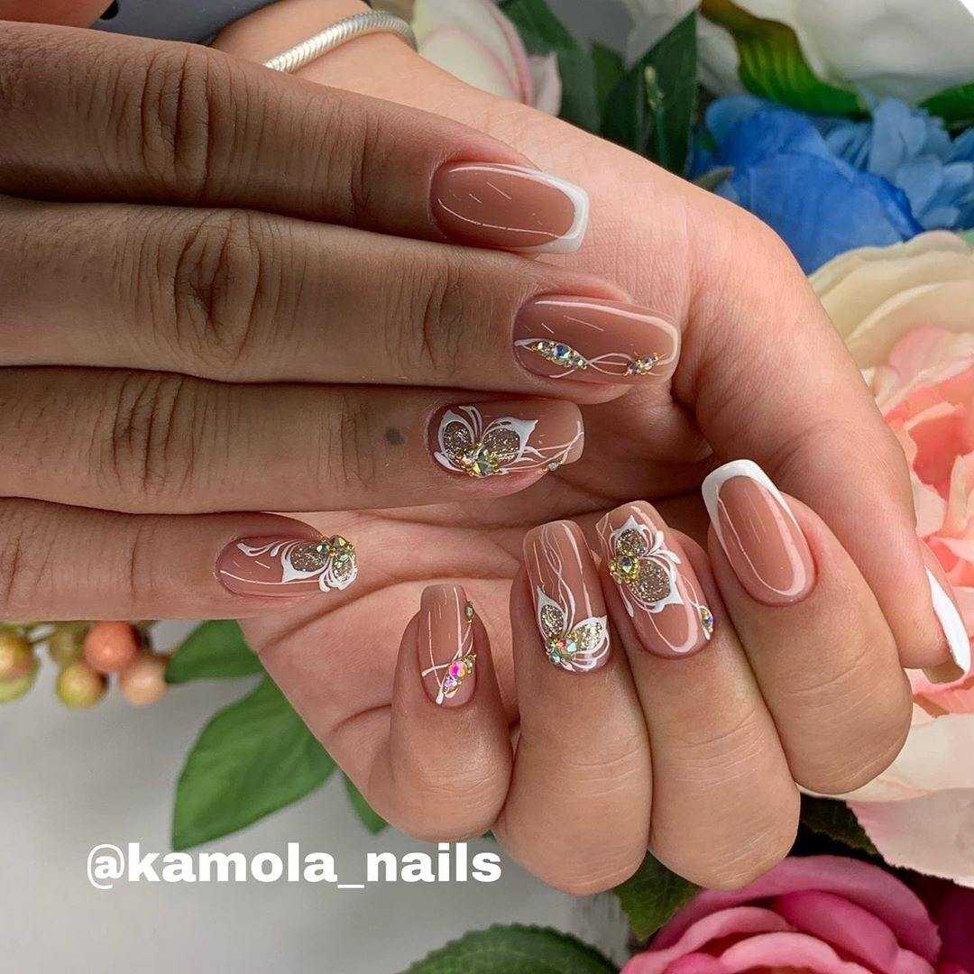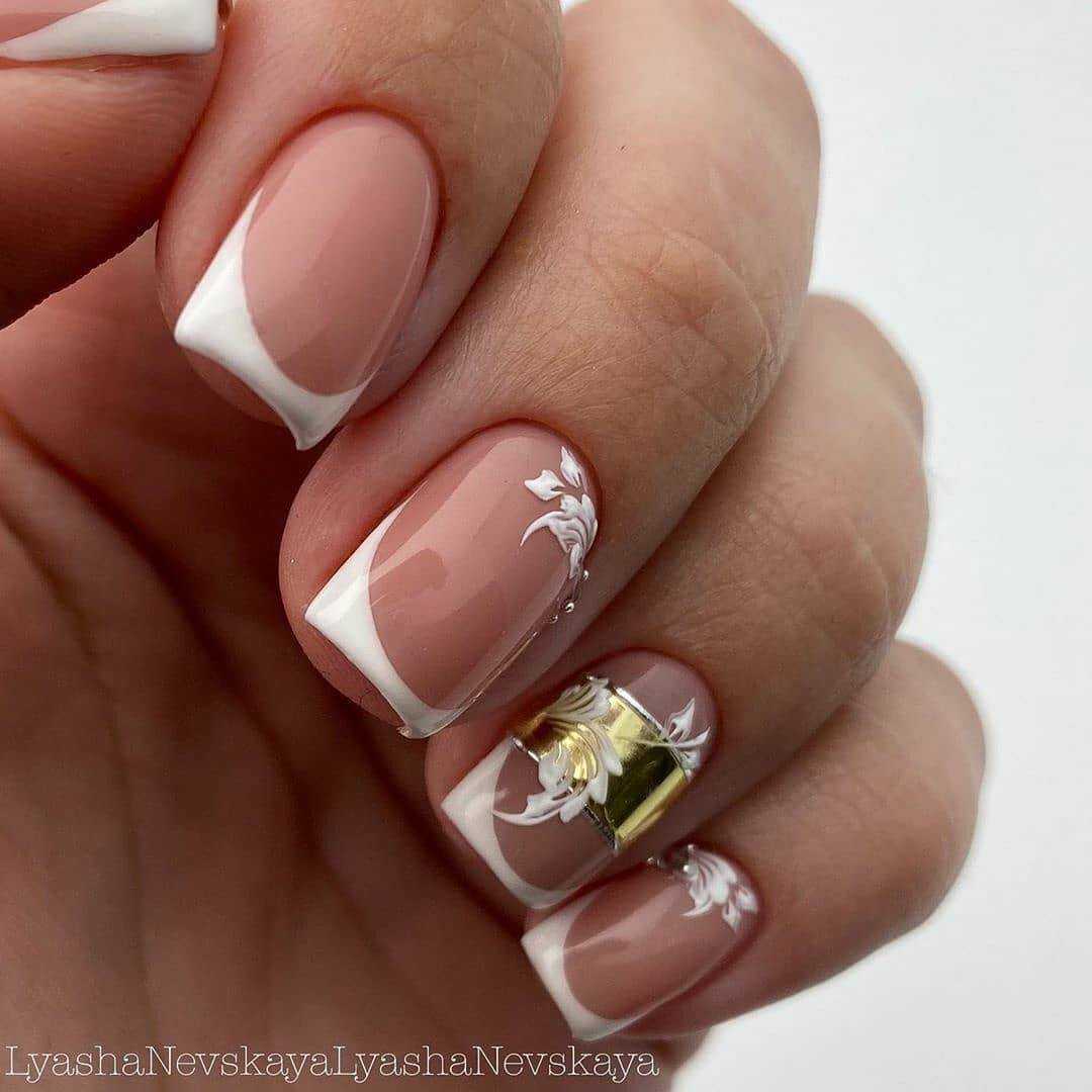 Нередко французский маникюр комбинируют с другими видами дизайна. Это может быть ажурное плетение, абстракция, цветочный и геометрический рисунок. А дополнительный декор в виде страз, блесток, втирки или жемчужных бусин идеально подходит на роль украшения.