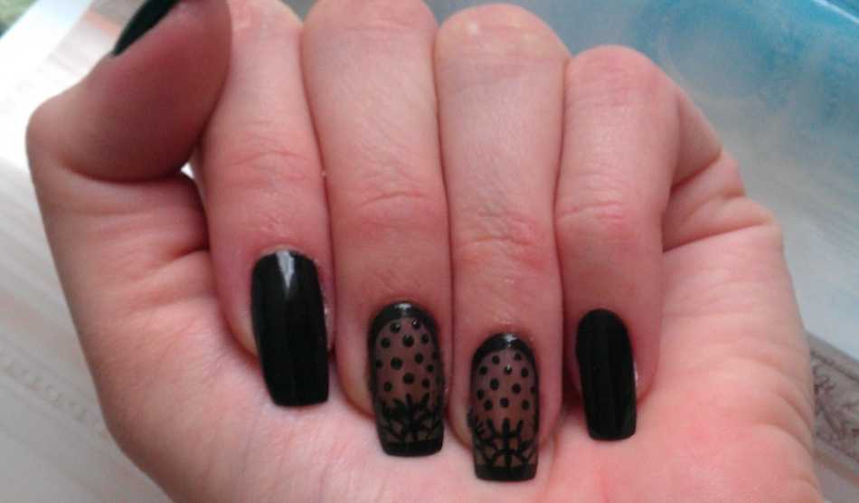 Красиво смотрится «вуаль», комбинированная с техникой негативного пространства. Например, часть ногтя может иметь капроновое оформление, а вторая — кружевной узор на неокрашенной ногтевой пластине.