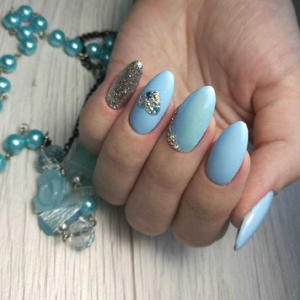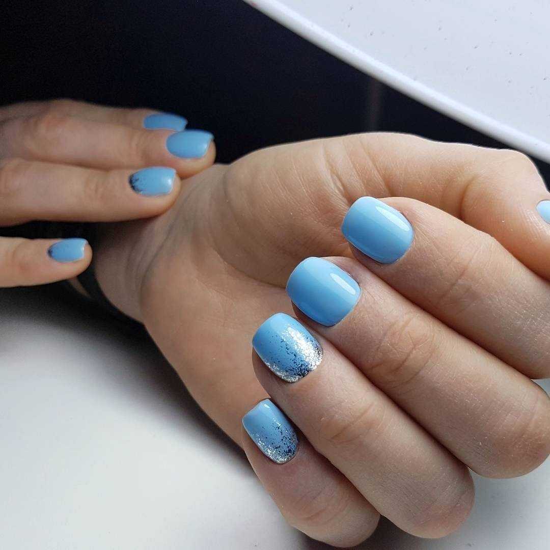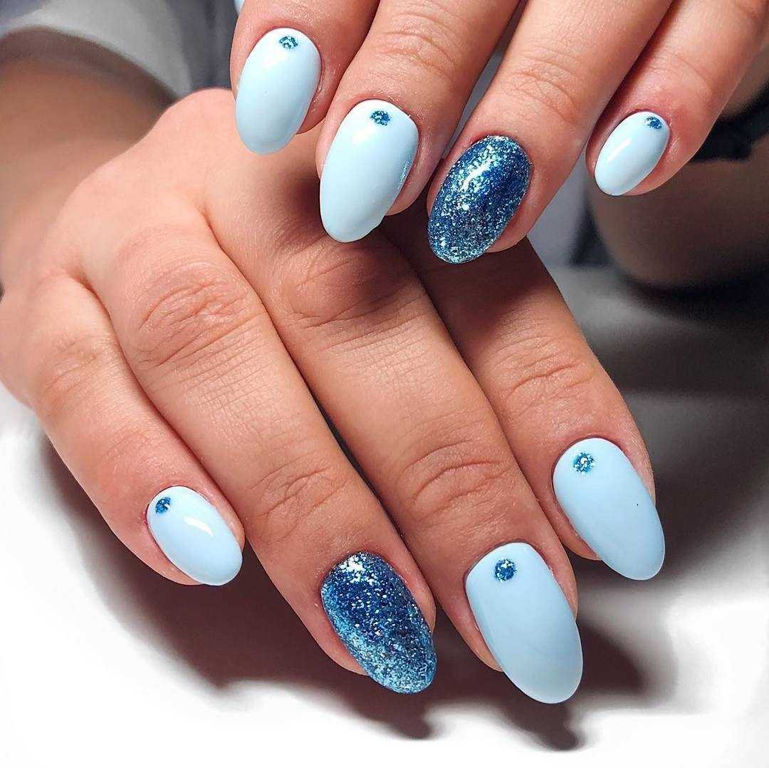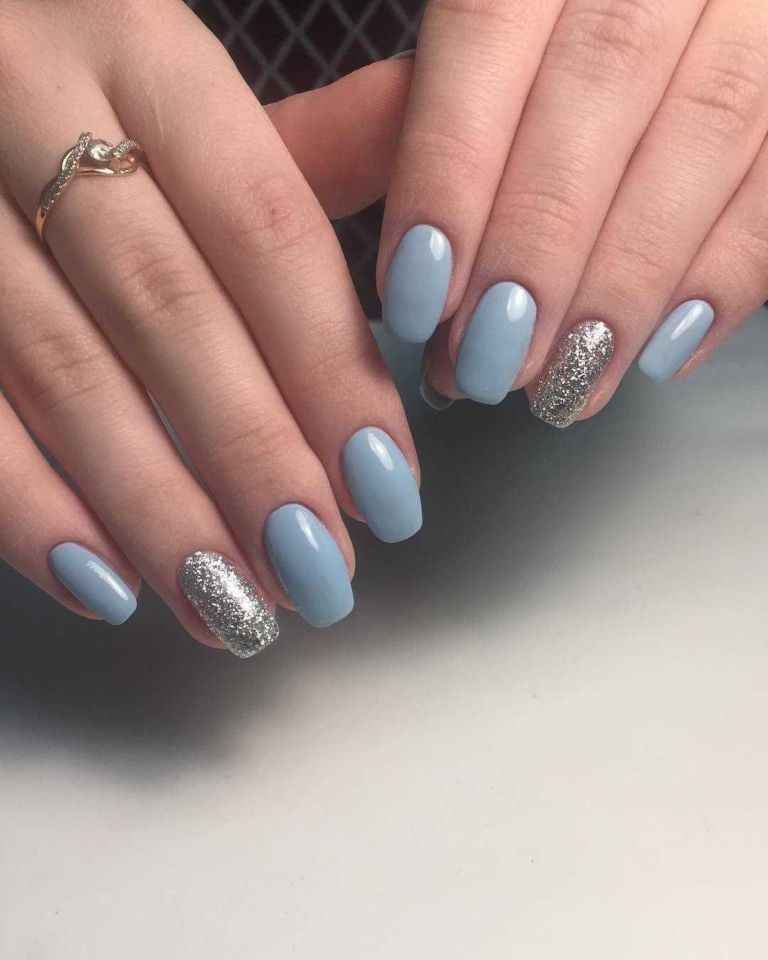 Голубой или синий оттенки на ногтях — отлично гармонируют с блестками. Тут нужно учесть один нюанс. Поскольку синий – это холодный «цветотип», то и блестки выбирают с этим учетом.
