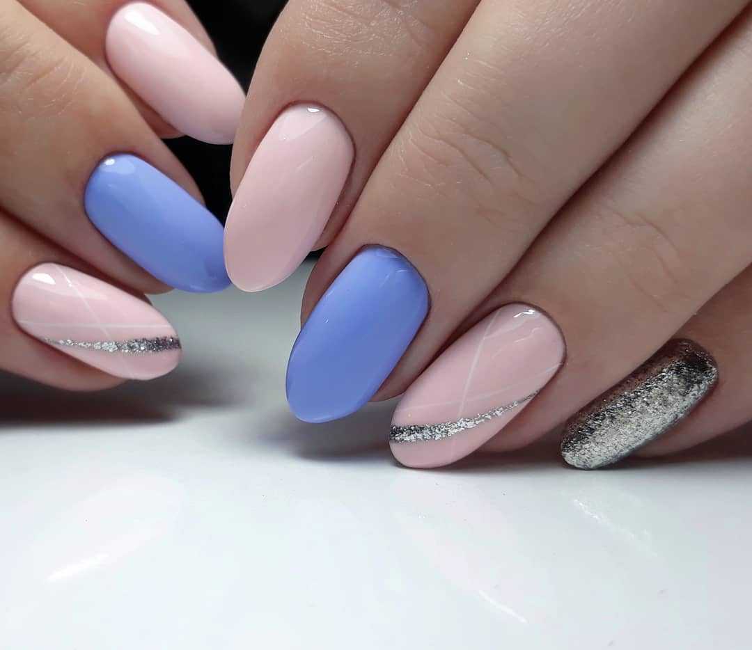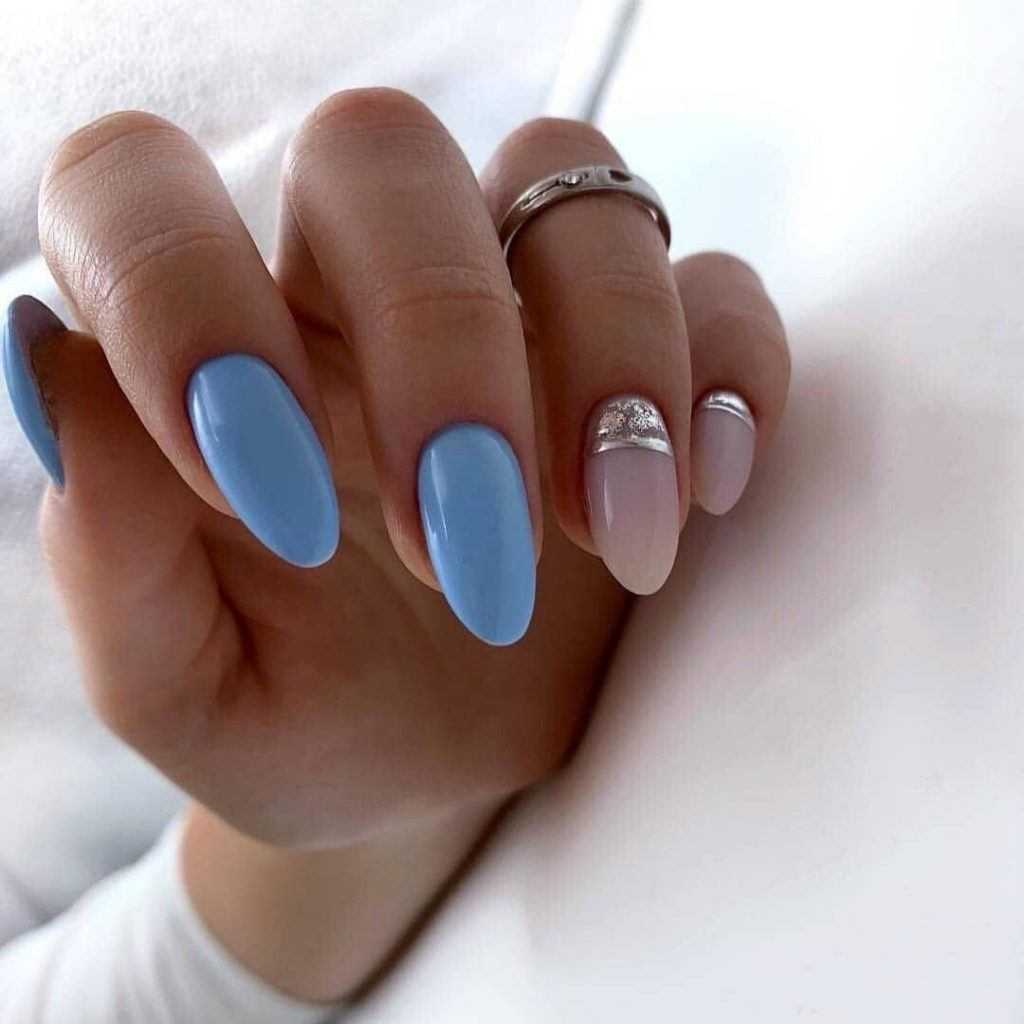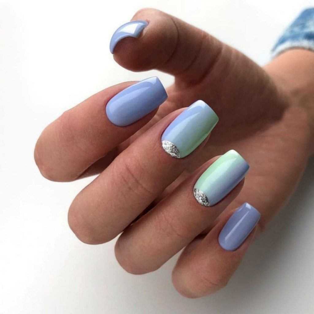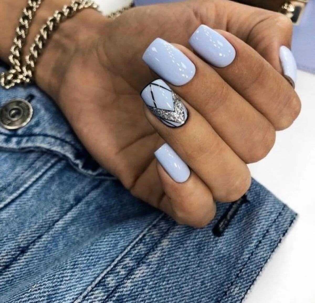 Голубой или синий оттенки на ногтях — отлично гармонируют с блестками. Тут нужно учесть один нюанс. Поскольку синий – это холодный «цветотип», то и блестки выбирают с этим учетом.