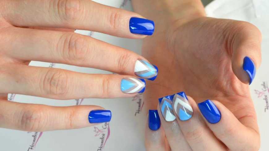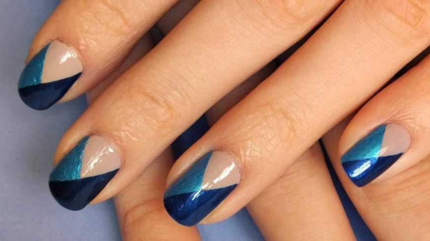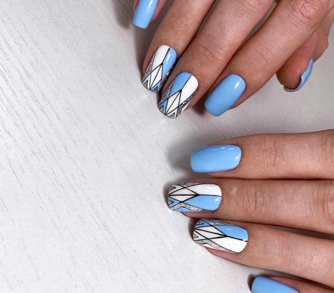 Если нравится маникюр с геометрическими узорами, то для их нанесения можно использовать трафарет, скотч, кисти или метод обычного нанесения. Во всех вариантах такого маникюра допускается сочетание синего с другими цветами.