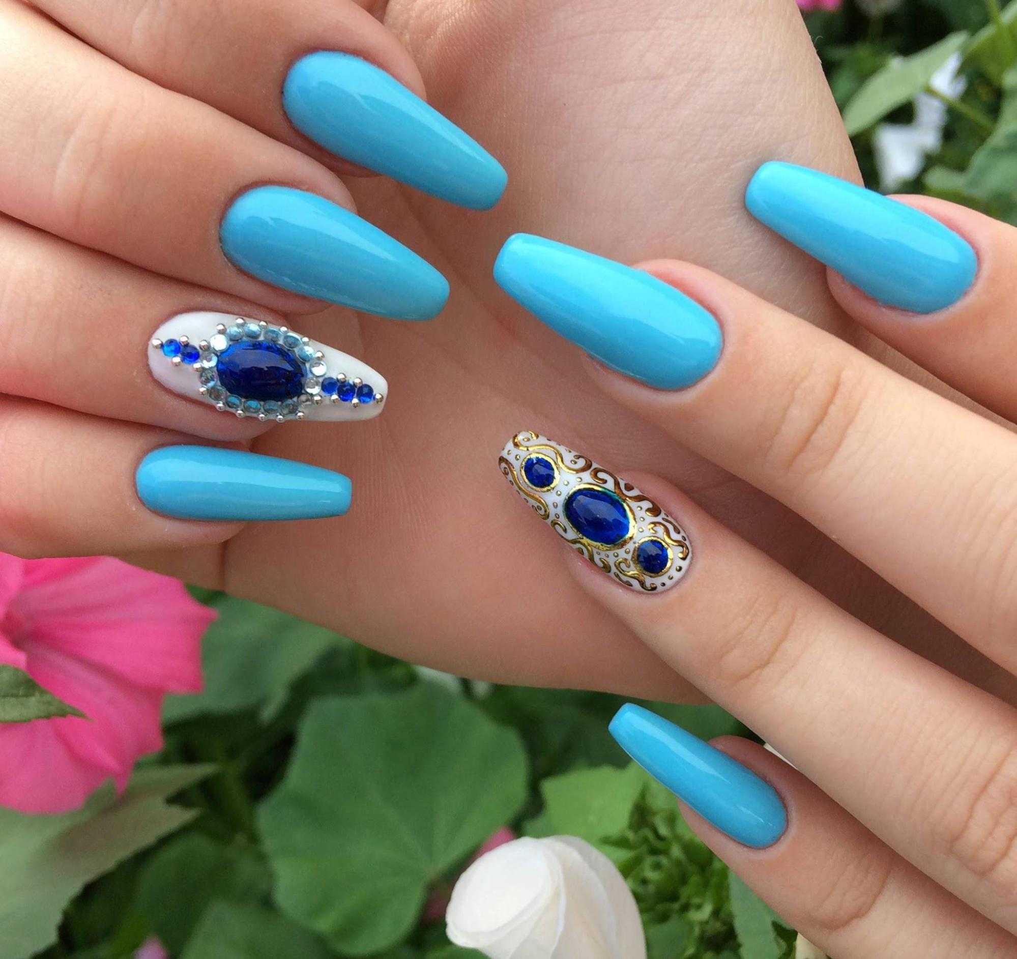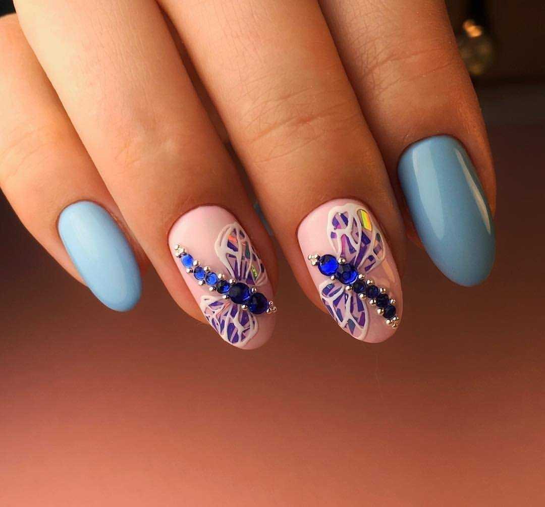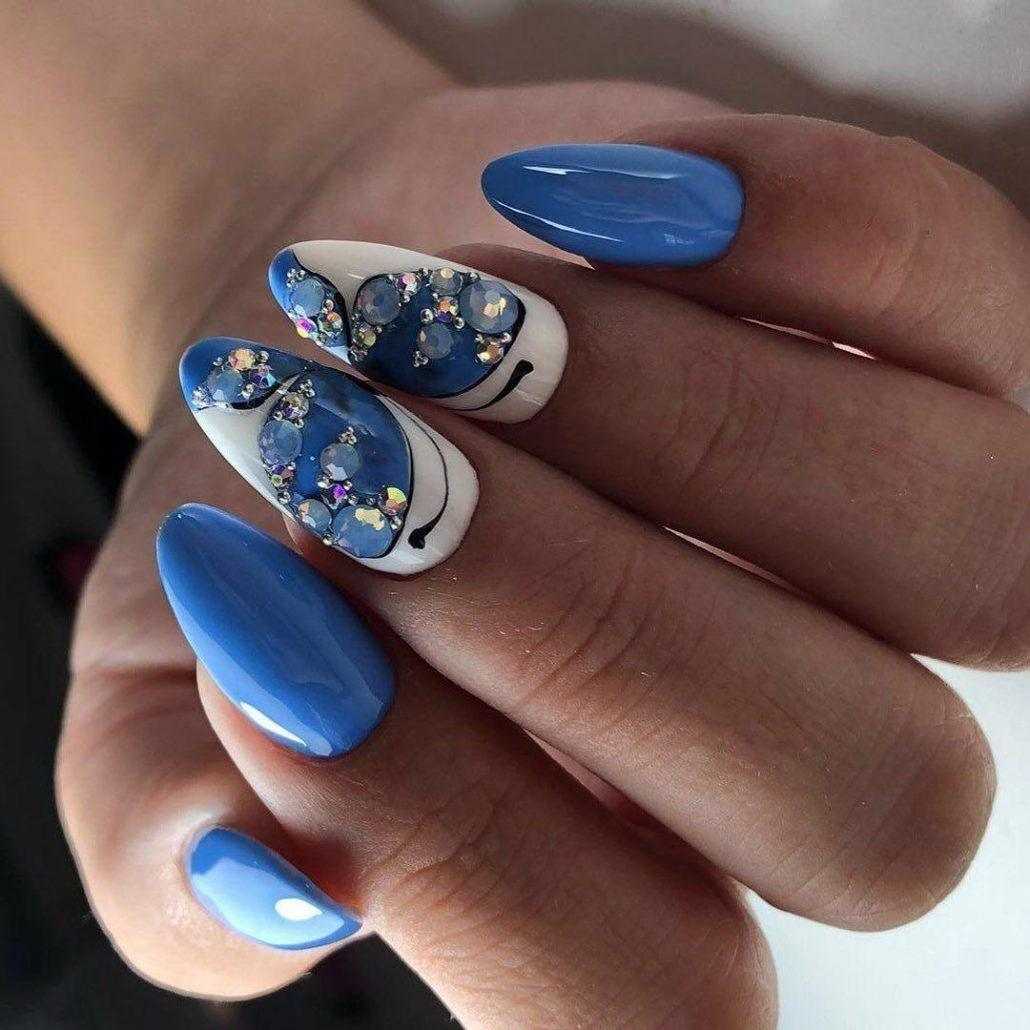 Синий маникюр со стразами в 2019 году все так же популярен, как и ранее для вечерних выходов. Ассортимент предлагаемого декора увеличивается, поэтому можно сотворить настоящие шедевры на ногтях, просто комбинируя грамотно бусины разного диаметра и степени блеска.