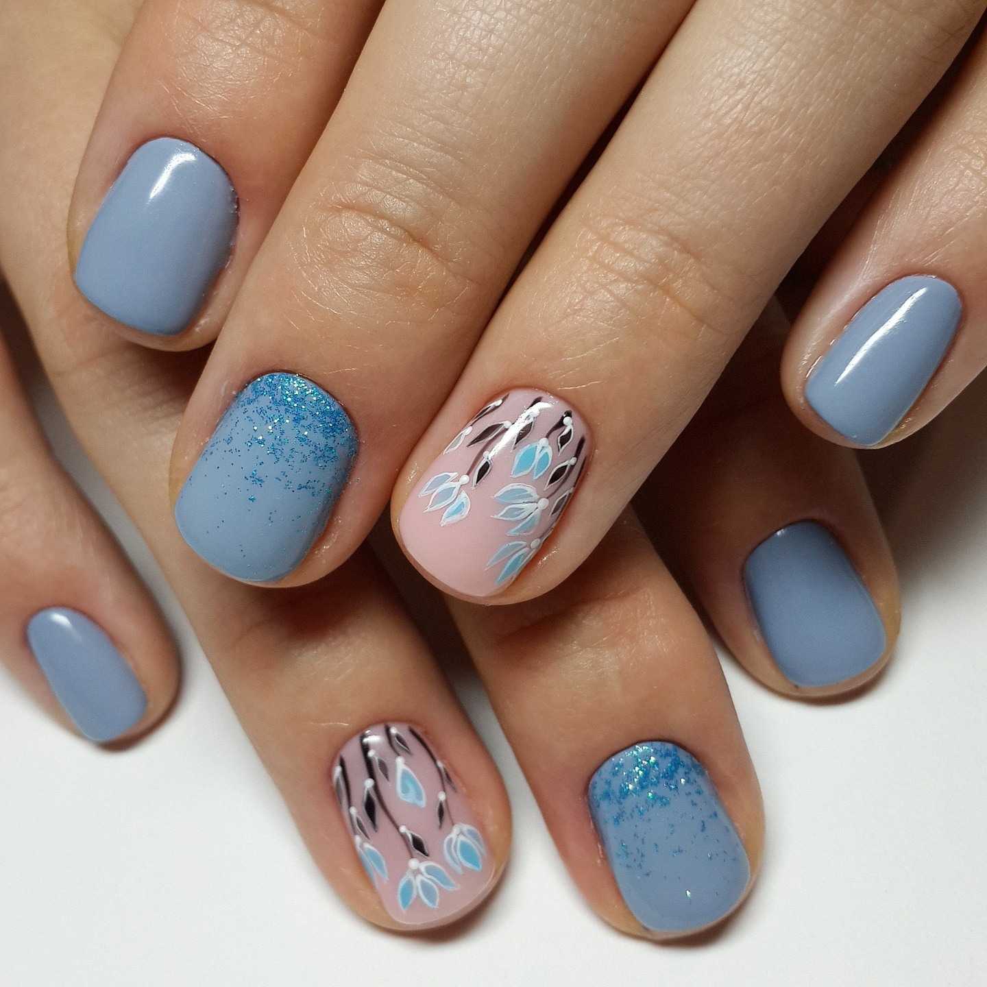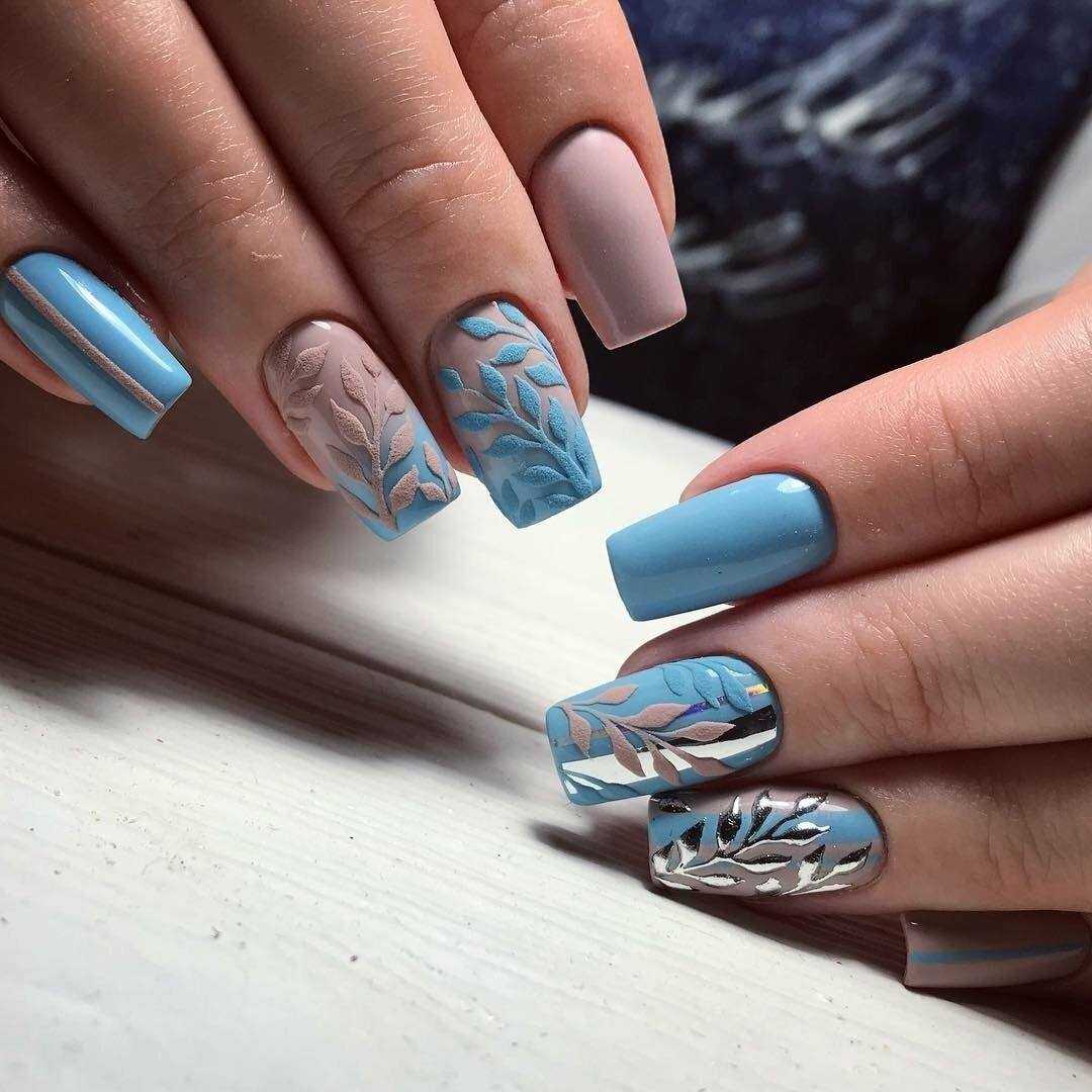 Летом и весной цветы появляются не только на клумбах, но и на ногтях. Если нужен дизайн поскромнее, выбирайте модный синий маникюр “веточки” с небольшими бутонами на полупрозрачной бежевой основе.
