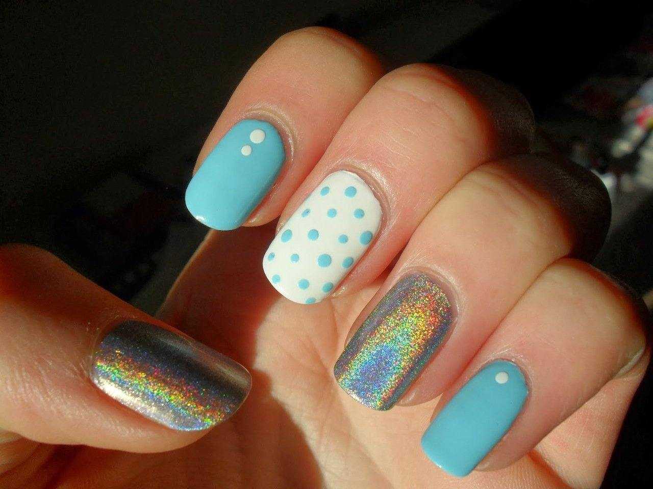 С принтом в горошек знакома каждая девушка. Он актуален не только для одежды, аксессуаров, но и для оформления ногтей. Тем более, что фон в виде покрытия голубого цвета идеально для этого подходит. Данный принт не слишком сложный, поэтому сделать его можно в домашних условиях. Конечно же, наиболее симметрично и четко его наносят, используя дотс. Это специальный инструмент с металлическим наконечником круглой формы. Он может быть разного размера. Именно с его помощью и получается отпечатать рисунок на ногтевую пластину. Что касается цветового решения, то на голубом фоне прекрасно смотрится черный и белый принт. В таком случае маникюр получается достаточно ярким, заметным.