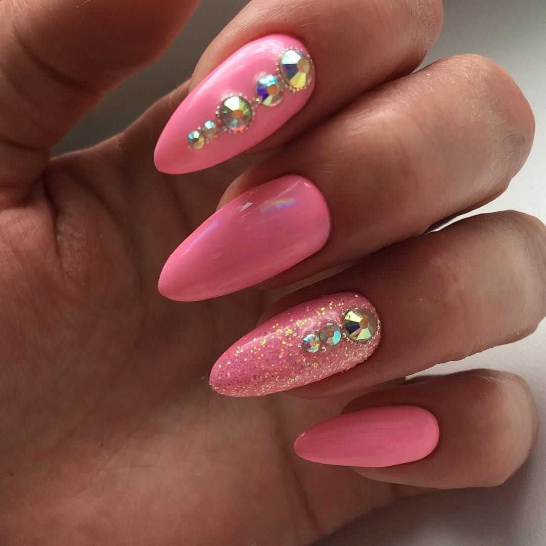 Для розового маникюра можно использовать как нежные тона: лиловый, пепельный, персиковый, так и насыщенные оттенки: малиновый, детский розовый и другие. Со всеми оттенками розового блестки и стразы будут выглядеть вполне уместно