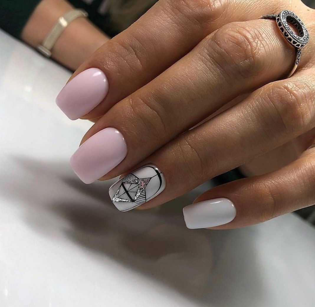Универсальным и практичным оттенком считается бежевый цвет. Он отлично смотрится на ногтях любой длины. Если хочется разбавить однотонное покрытие, то можно использовать различные модные техники. Так, согласно модным тенденциям на пике популярности мраморный эффект. Стильно смотрится дизайн с использованием графических рисунков, геометрических фигур. Причем, они могут украшать только 1-2 пальчика. В этом случае они не перегрузят задуманный нежный дизайн и при этом придадут оформлению особую колоритность. Несмотря на нейтральность бежевого цвета, при выборе различных оттенков для нежного маникюра, можно создать эффект омбре, который также очень популярен в настоящее время.