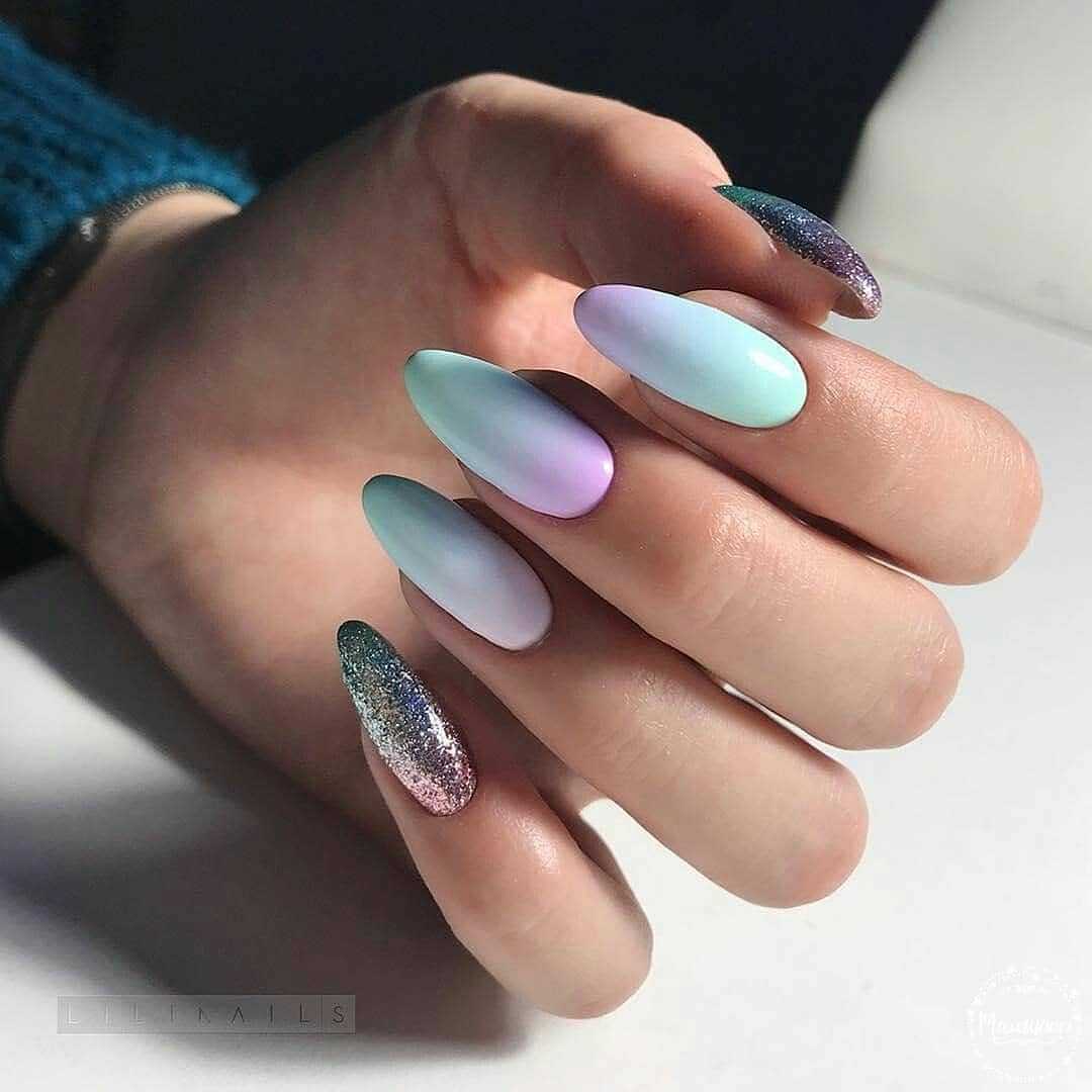 Вкусы у всех разные, если настроение сделать не френч или nude, то смело выбирайте сочетание двух зеленых оттенков с минимумом дизайна. А также любителям минимализма могут понравиться тонкие полоски пастельных и бирюзовых тонов на прозрачной основе — получится по-летнему привлекательный маникюр. А короткие ногти в бирюзовых тонах дополнительно можно украсить блестками, выделив один ноготь.