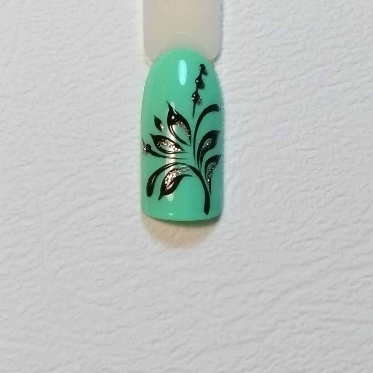 Шаг 6 – Для красоты можно продублировать некоторые элементы блестками. Если вы рисовали гель-краской без липкого слоя, то ваш дизайн на этом этапе готов. Если же вы рисовали вензеля гель-лаком, то после прорисовки нужно перекрыть дизайн глянцевым топом, чтобы зафиксировать получившийся рисунок.