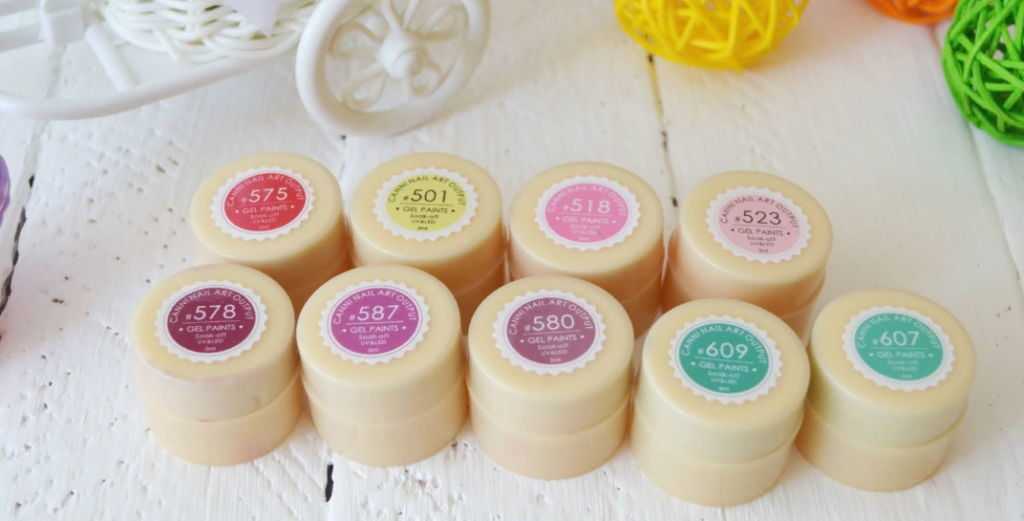 Акриловые краски — ими рисуют в салонах, они доступы в художественных магазинах поштучно и проще в использовании, чем лак. Еще они очень быстро сохнут и не текут. Их текстура не подходят для нанесения дотсом. Акрил, нанесенный на маникюр только с базовым покрытием, вреден для ногтей, по этому база должна быть в несколько слоев. Так же акрил нуждается в закрепителе, иначе смоется водой.