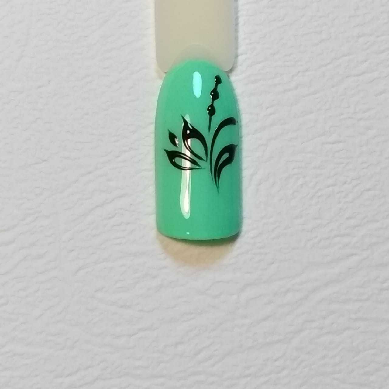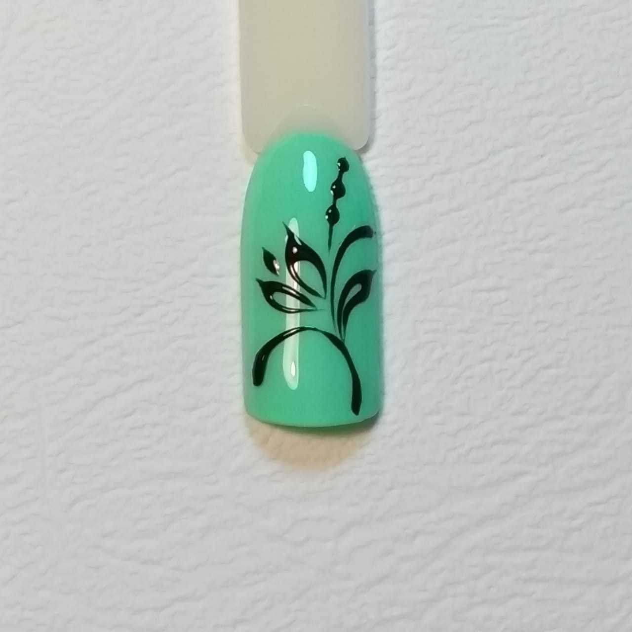 - Перенести каплю на ноготь и плавными неспешными движениями нарисовать узор. Для объемных узоров, линии следует удваивать, а пространство между ними оставлять незаполненным.