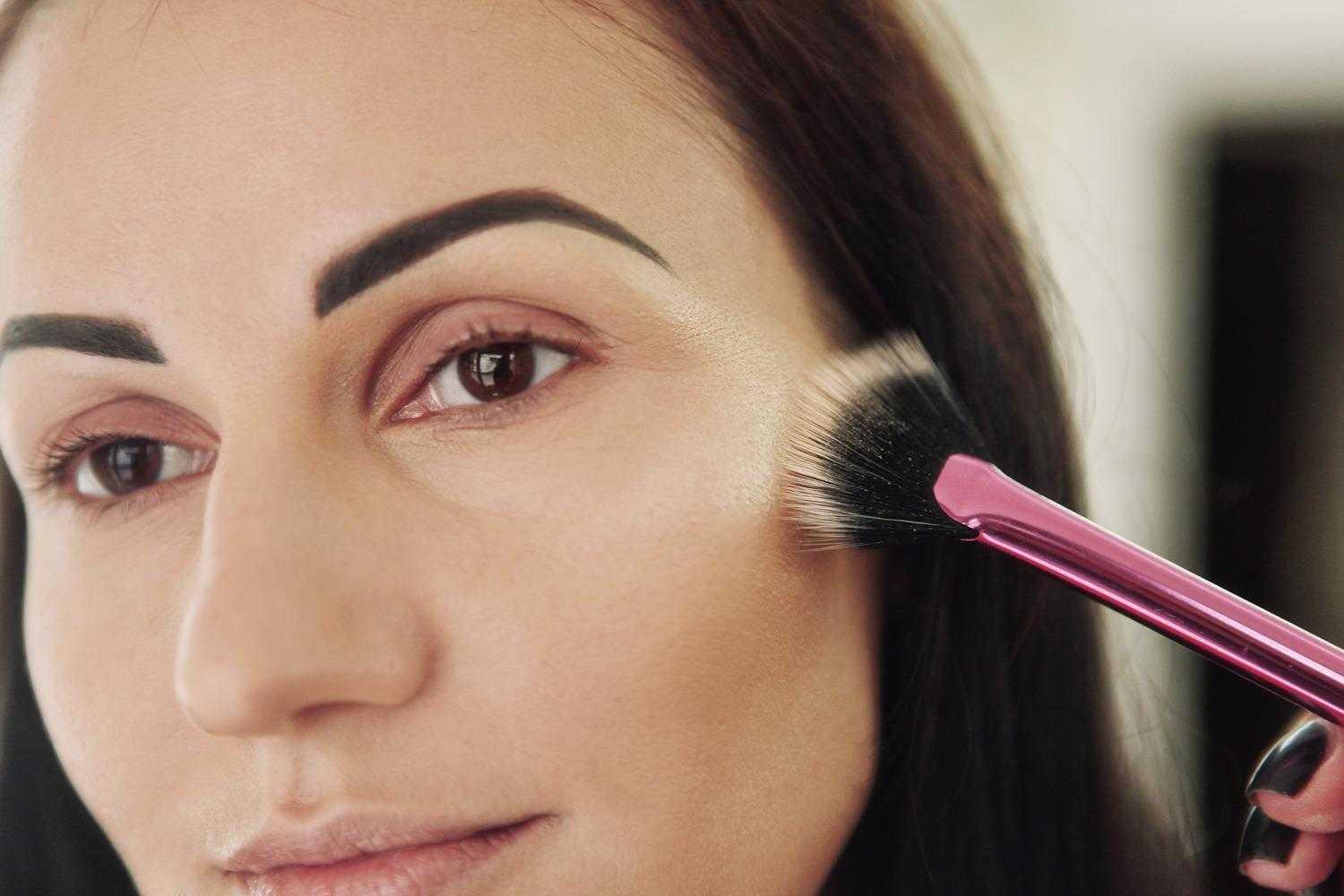 Работая со скулами крайне важно не переусердствовать и проследить, чтобы границы тушевки хайлайтера были менее заметны. Для этого нужно мягко втушевать «сиялочку» в тональный крем кистью или кончиками пальцев;