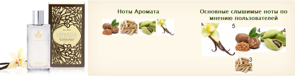 Флакон LaVanila Pure от Vanilla Fragrance; официальная пирамида композиции, заявленная компанией-производителем; пирамида, определенная потребителями парфюма