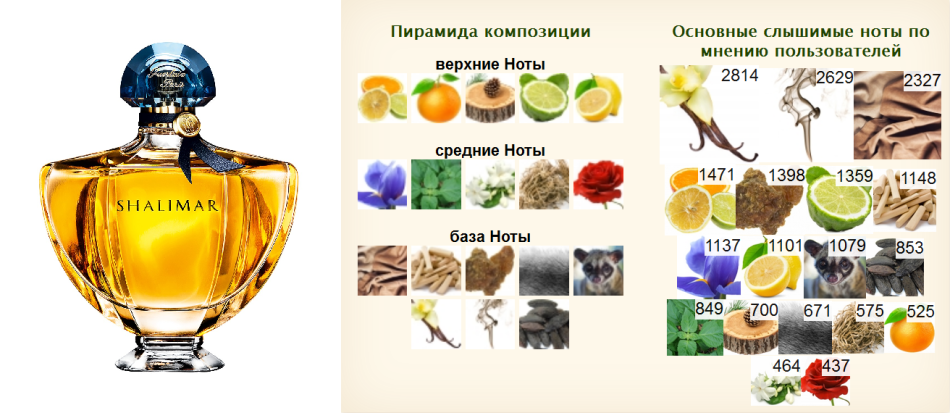 Флакон Shalimar от Guerlain; официальная пирамида аромата, заявленная компанией-производителем; пирамида, определенная потребителями парфюма